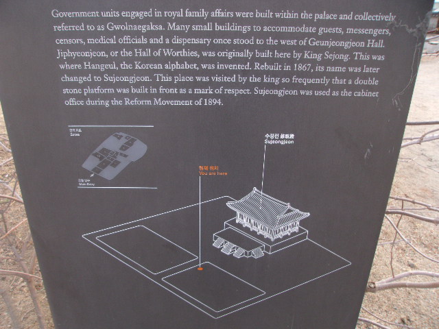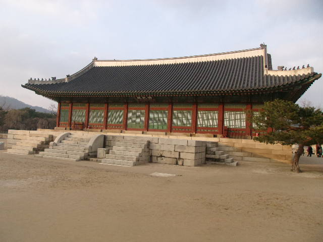 慶会楼の南側にひっそりと佇むこちらの建造物は、元々は集賢殿と呼ばれていました。現存するのは復元の建造物ですが、世宗大王の時代に遡る由緒ある建物で、ここで世宗大王がハングルを発明したとされています。尚、その後も何かと国王の出入りが多い”学堂”であったため、建物の前には国王への敬意を表するための石造りの基壇が設置されているのもここの特徴の一つかと思います。