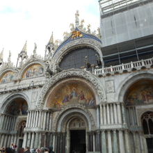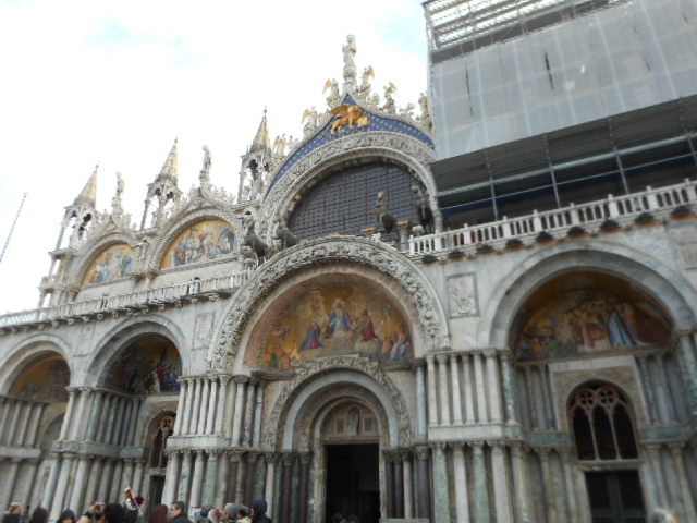 サン・マルコ広場に在し、ビェネツィアの守護聖人像に象徴される寺院で、内部は金地のモザイク画が素晴らしい輝きを放っていますし、外、前面のアーチ壁面は聖マルコの亡骸の移送の様子を描いているそうで、外、寺院内も素晴らしいです。