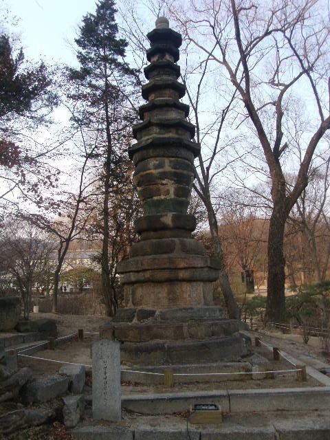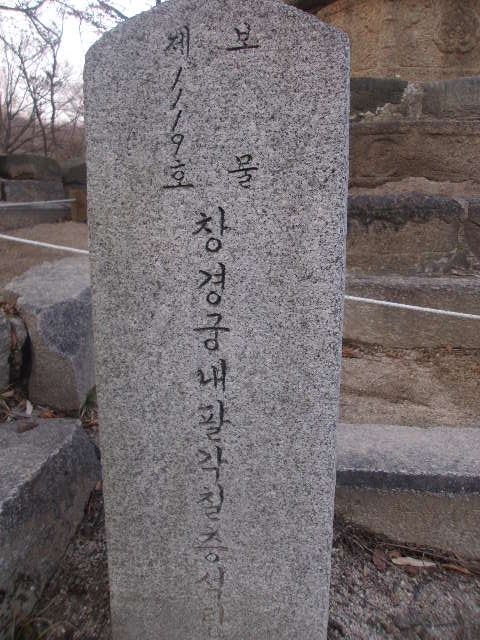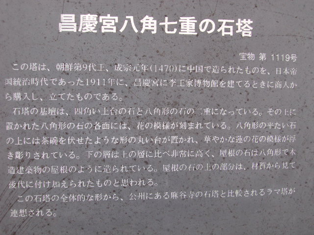 昌慶宮内には、実は知られざるマニアックな名所が色々と見られましたが、こちらはそのうちの一つで、北部エリアの大春塘池の岸辺に、人目を憚るかのようにひっそりと建てられていました。でも国の宝物1119号にも指定されている由緒ある名塔なので、是非多くの方にご覧頂きたいと思います。