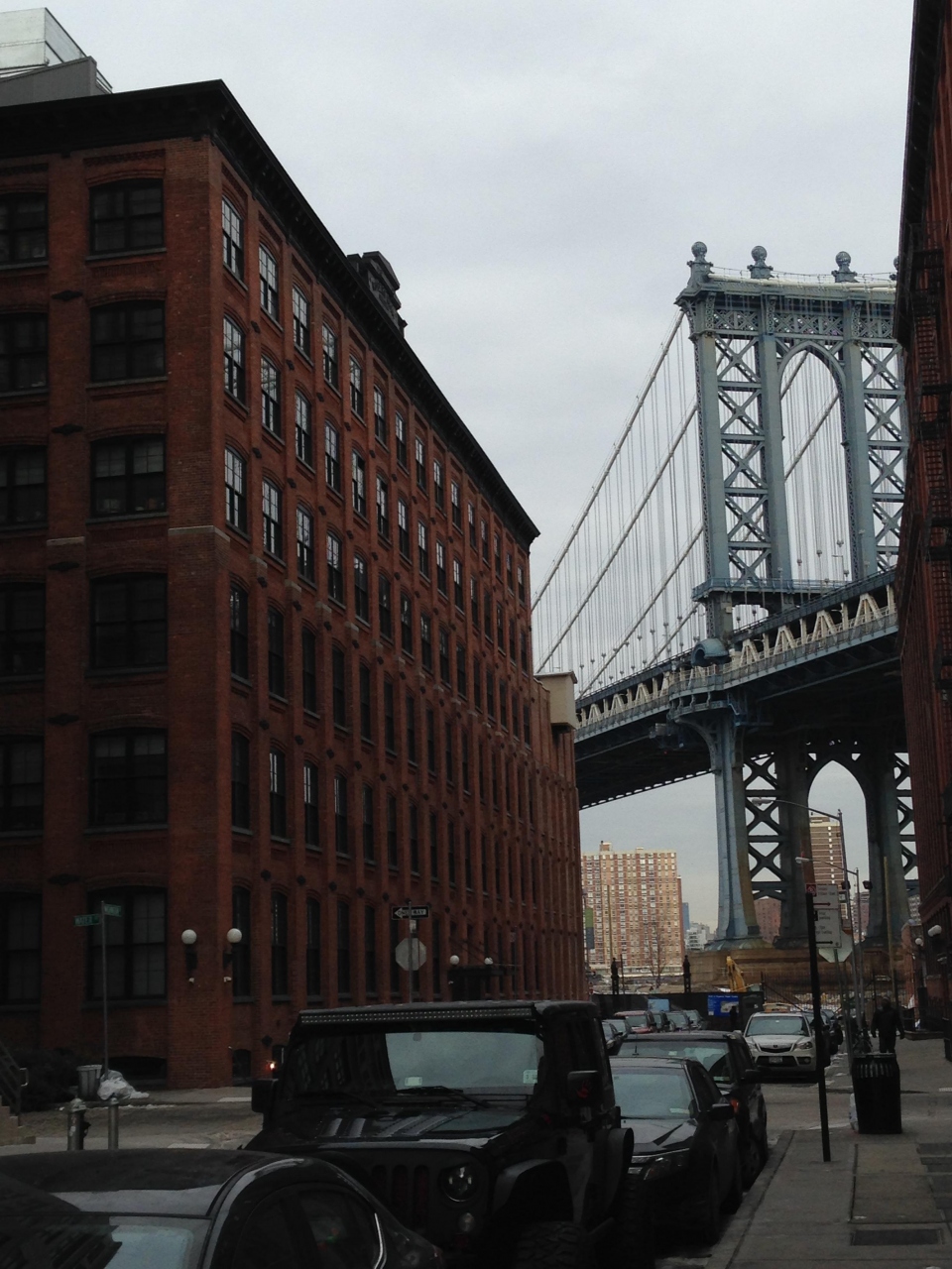 後ろを振り返ると、ブルックリンの元倉庫だった赤茶色の建物がたくさん見える、オシャレスポットです。