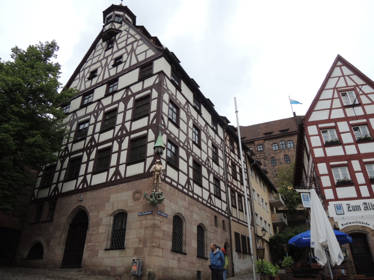 カイザーブルクをあとに道なりに下りてくるとティア・ゲルトナ―門に出ます。側壁には木材で日本でいう犬走りの回廊が組み上げられており、門の奥から上に登れます。このあたりは昔からの町並みが残っていて思わずカメラのシャッターを押してしまいます。門に向かって右側の甲冑姿の聖ゲオルクが飾られた角の家は「プラトゥ・ハウス」という武具職人の仕事場だったそうで、家の前には大小二つのウサギの彫刻がありますよ。