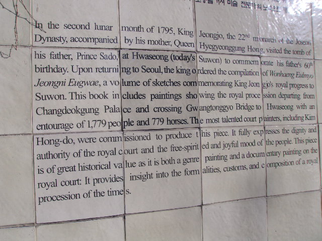 清渓川沿いの長通橋付近に延々と続く壁画がこちらで、細部を丁寧に見ながら歩くとかなり時間がかかるかと思います。所々にその付近の壁画の具体的な行列の内容がハングルと英語で記されている案内板もあって、これらを読みながら進むと更に時間がかかりますが、より造詣が深まって楽しめるかと思います。尚、壁画の始まり部分には、より大きな解説文が壁画そのものに刻まれていますので、進行方向としては、どちらかと言えば西側から歩いて、先にこの長文を読まれてから、以後の行列壁画の細部を眺める方が良いかと思います。