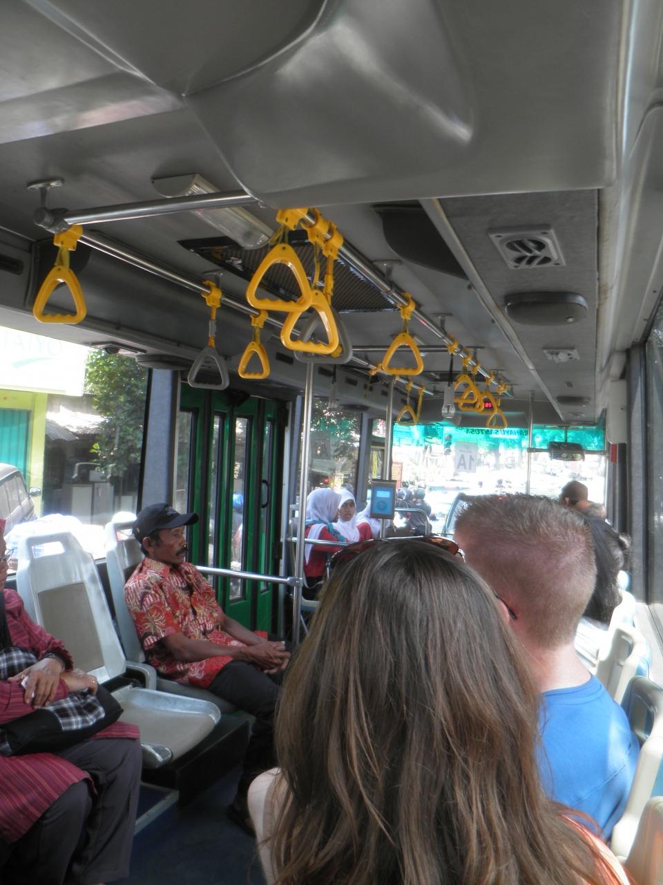 世界遺産のあるブランパナン駅からジョグジャカルタの繁華街マリオボロ通りまで、バスシステムのトランスジョグジャを利用しました。 ジャカルタのトランスジャカルタに比べると、車体は小さめで、夕方の通勤帰りの時間帯だったので、とても混雑していました。外国人観光客もよく利用するためか、乗務員はなれた感じで対応してくれました。 また、トランスジャカルタみたいに、男女を分けるマナーはないようでした。