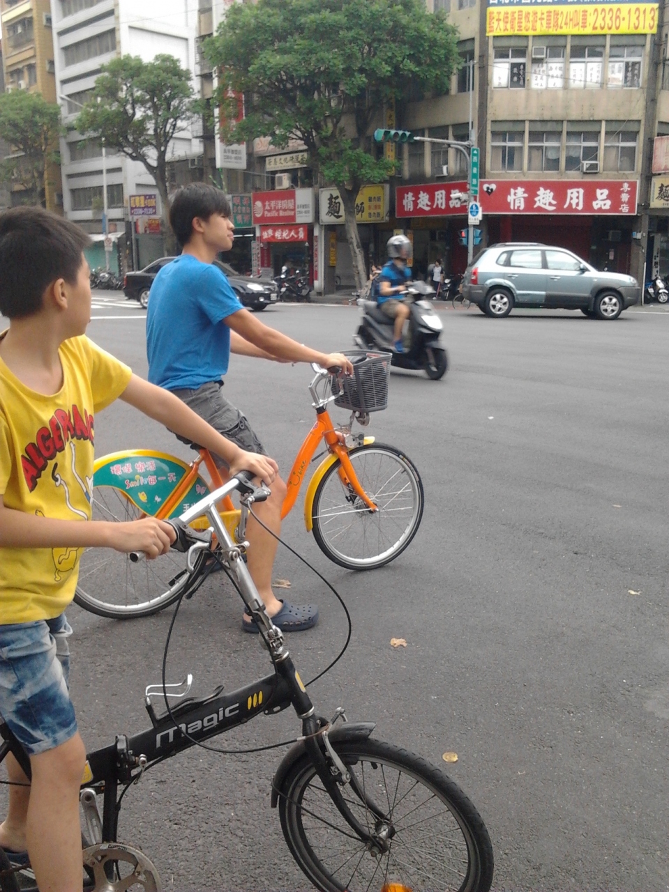 オレンジの自転車で、玉山銀行という広告とキャラのねこが入った自転車です。ユーバイクと言われているもので、ユーバイクが並んでいる場所の近くにあるステーションで自分の携帯番号とメールアドレスを入力して、MRTのカード番号も入れると、MRTのカードをかざせば乗れるようになります。お金はMRTのカードから差し引かれます。30分無料なので、ちょっと台北を移動したい時など便利です。ほとんどのMRT駅近くや公園近くにステーションがあります。一度焦ったのは、返そうと思ったら、すべての駐輪場が自転車で埋まっていて、お金がどんどん加算されて焦りました。