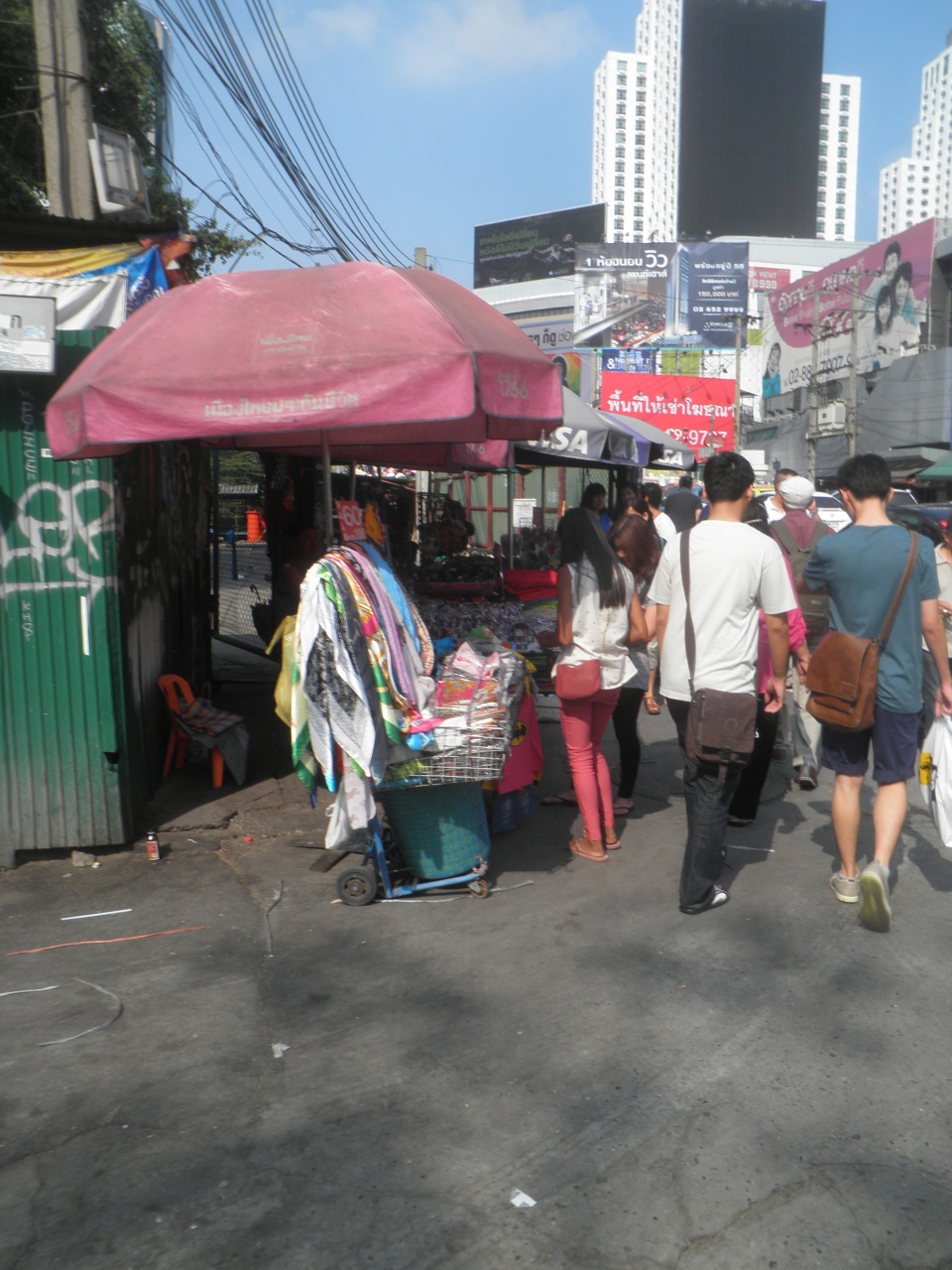 衣料品を買うために、センセーブ運河のボートに乗ってプラトゥナーム市場に行きました。伊勢丹デパートの近くで下船して、デパートは逆のほうへ行きました。 迷路のようにつづく通路、蒸し暑さや独特の匂いで気分が悪くなりそうなので、屋外に出るとそこにも衣料関係の出店が並んでいました。