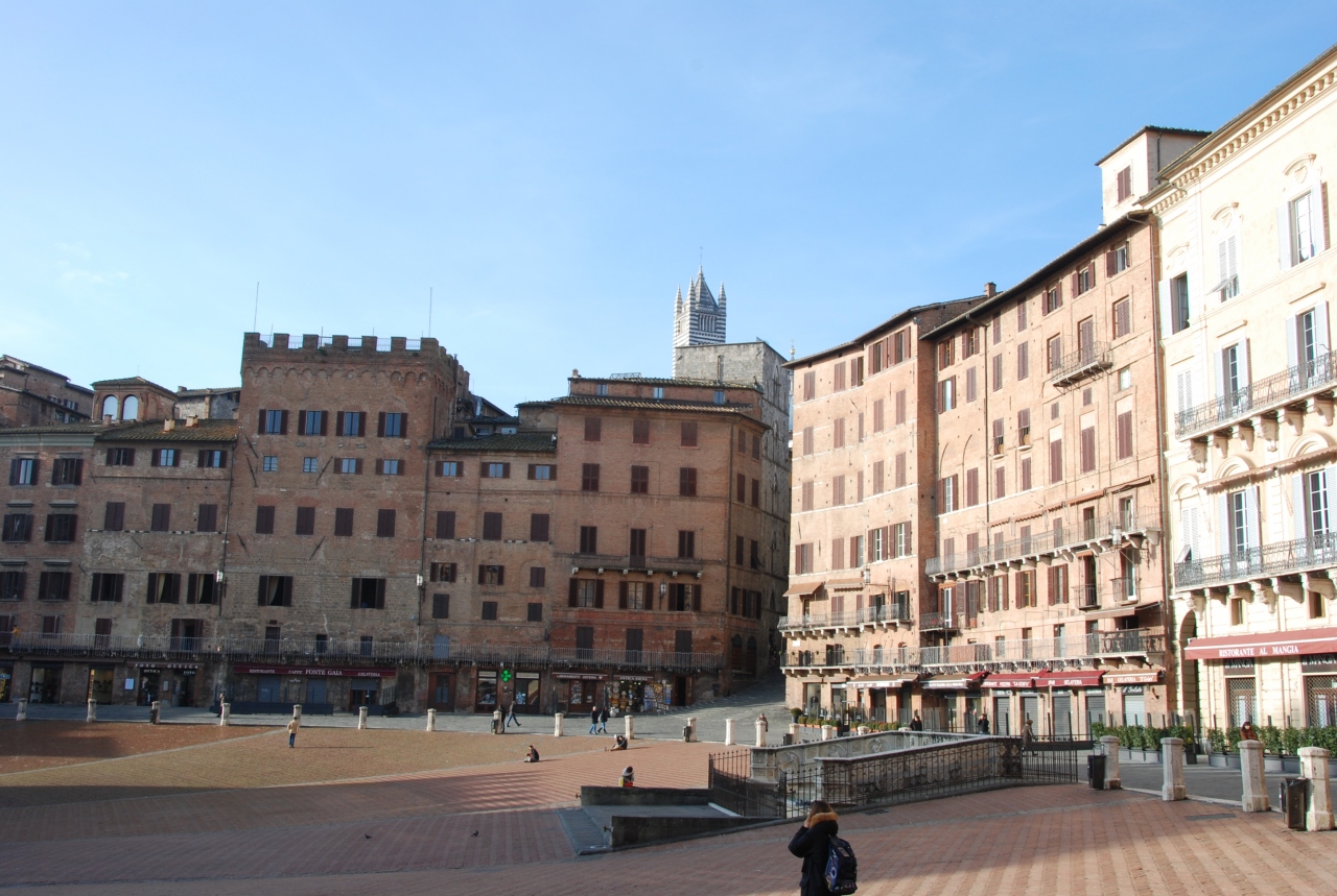 フィレンツエ発の英語ツアーに参加して行きました。40人ぐらいのツアーですが日本人は私たち夫婦だけでした。最初の訪問地がここシエナでした。煉瓦作りの建物が並び中世の石畳、大聖堂、広場、1時間ぐらいの滞在でしたがあまりこんでなくゆっくり堪能できます。坂道があるので上り下りが大変でした。