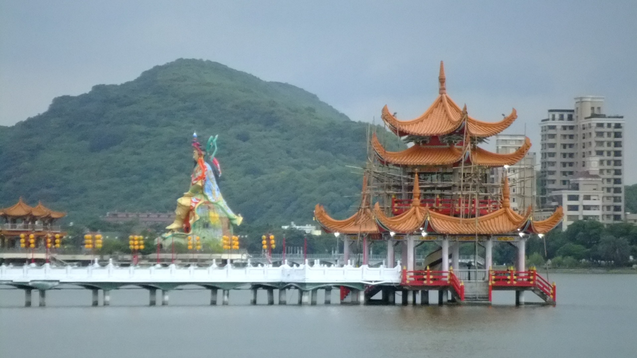 蓮池潭の観光場所のひとつ。蓮池潭の周辺には不思議とカラフルな建物が集まっているのだが、そのなかでは一番普通気味の落ち着いたためもの。水上に長めの橋が渡されてあり、その橋を歩いていくと、東屋風のこの建物に着く。ちょうど整備中(工事中)であったけれど、湖の風も気持ちよく、他の建物も見えるので、なかなかよかった。