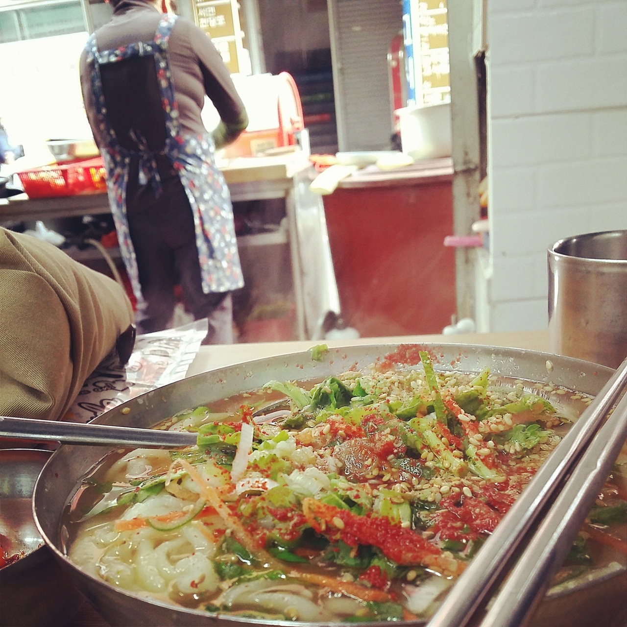 入口ではアジュンマ達がせっせと麺やキンパを作ってて、活気のあるお店です。