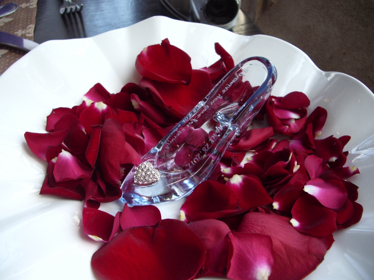 ちりばめられたバラの花びらの上にガラスの靴が置いてあり、キャストさん達からの温かいお祝いの言葉で祝福され、写真撮影の後、シャンパン、デザートを運んできてくれます。