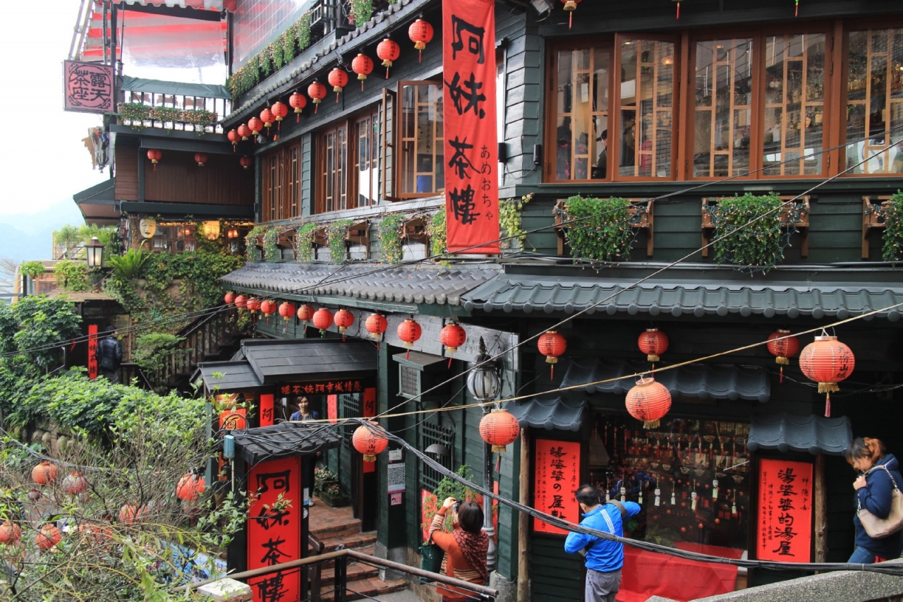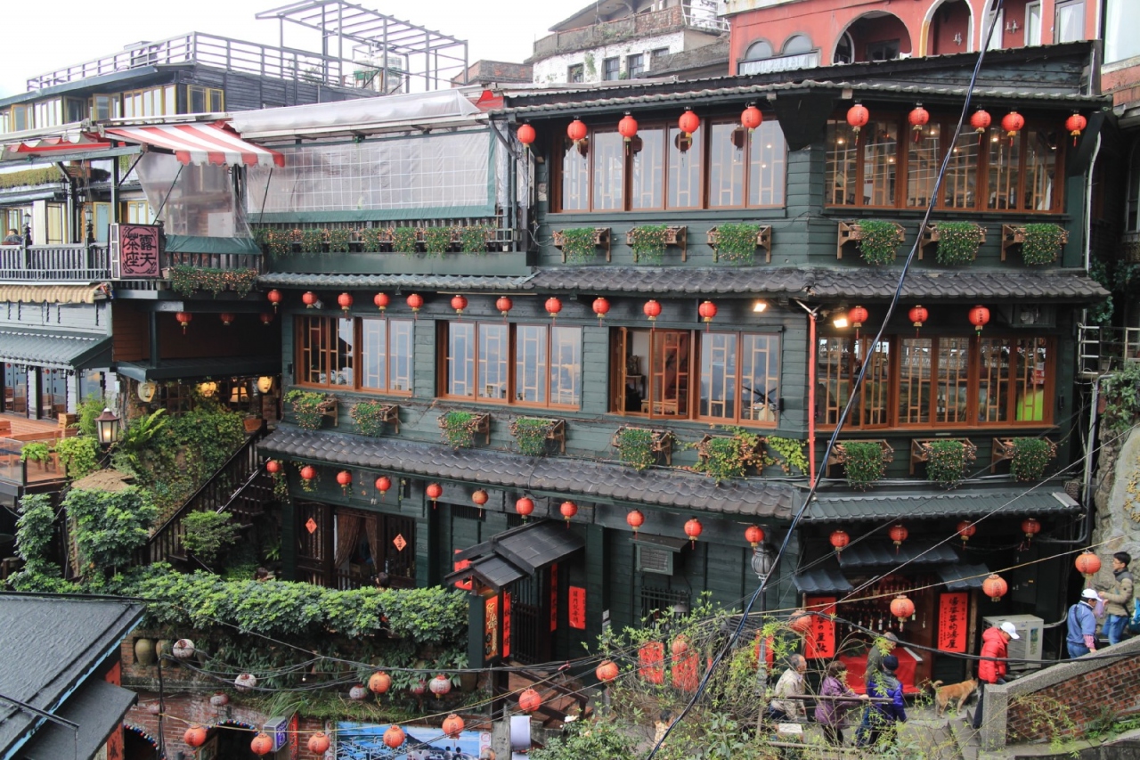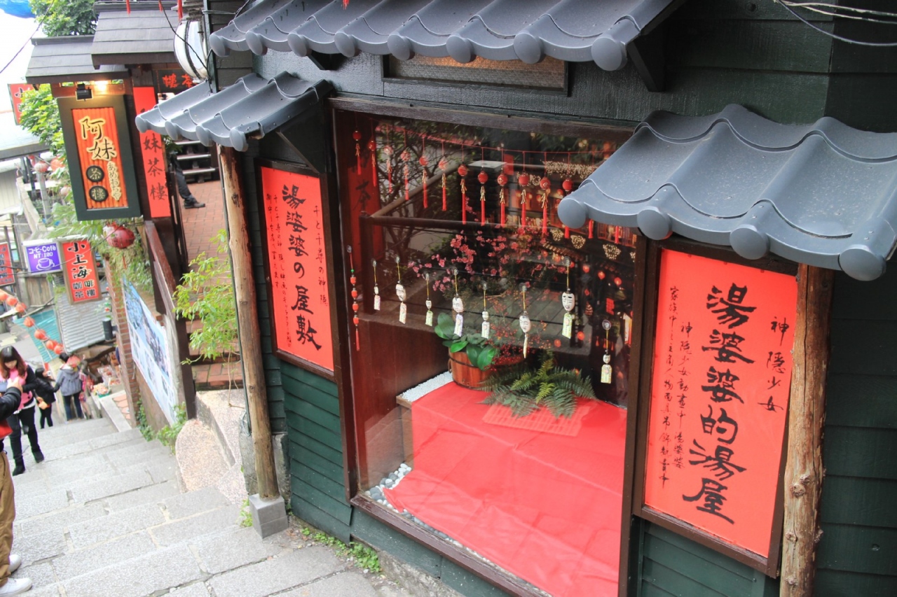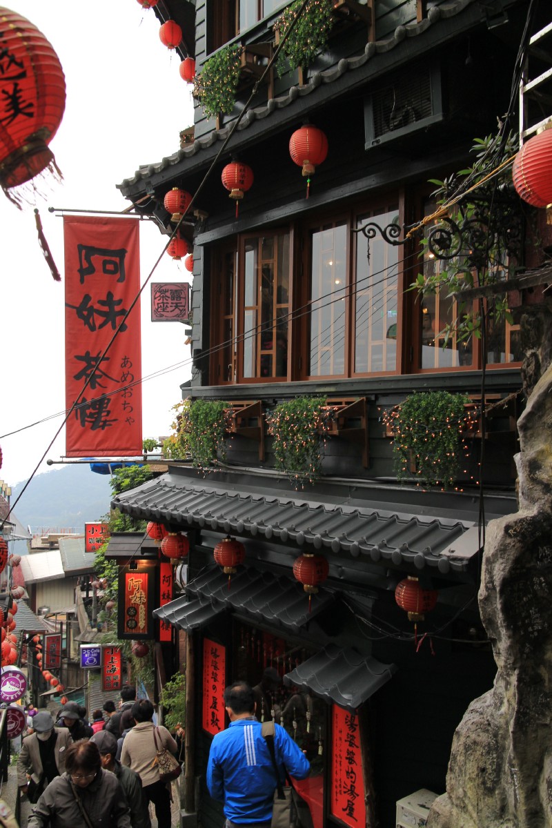 九イ分老街から基山街を抜けた奥の方に豎崎路があり道幅が急に狭くなり急な階段の途中には阿妹茶酒館があります。団体ツアーではこのあたりのレストランで食事になるようでその時は皆が写真を撮るので場所取りも大変です。