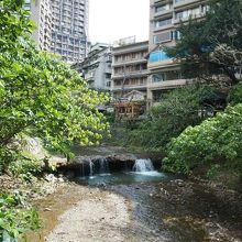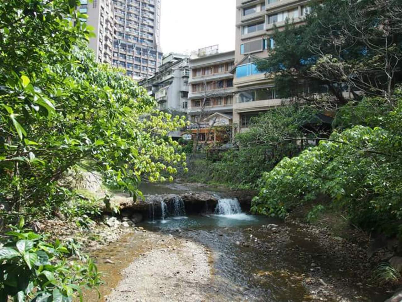 駅から温泉街の奥へは公園内を通って行けます。非常に綺麗に整備された公園で、癒されること間違いなし。草木などに南国の気配があり、どことなくバンコクの公園を思い出されました。おとなしい野良犬が昼寝をしているのもタイっぽい。地熱谷の方に近づくと、温泉小川が流れていて、足湯のようにして遊ぶことができ楽しいです。