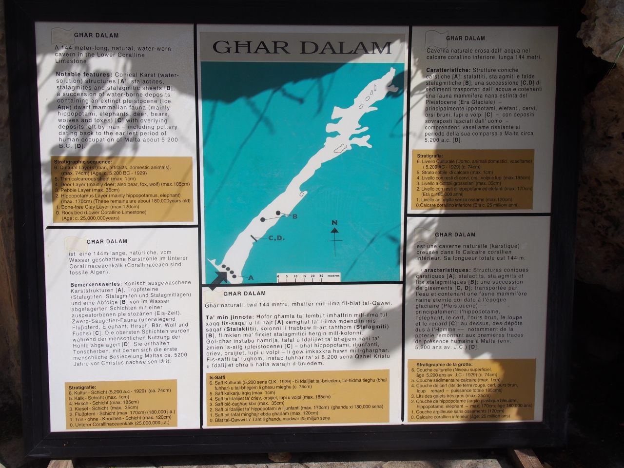マルタ島内の周遊観光2階建てバス(ホップオン、ホップオフ)の南回りの停車場所であったので見学しました。博物館とその後に洞窟の見学ですが、およそ1万年前の象、鹿、かばなどの骨や人が生活していた痕跡がみられるという洞窟です。洞窟は50mほど奥までは入れます。しかし、これが学問的価値や観光スポットとと思うとがっかりです。5ユーロの入場料の価値はありませんでした。