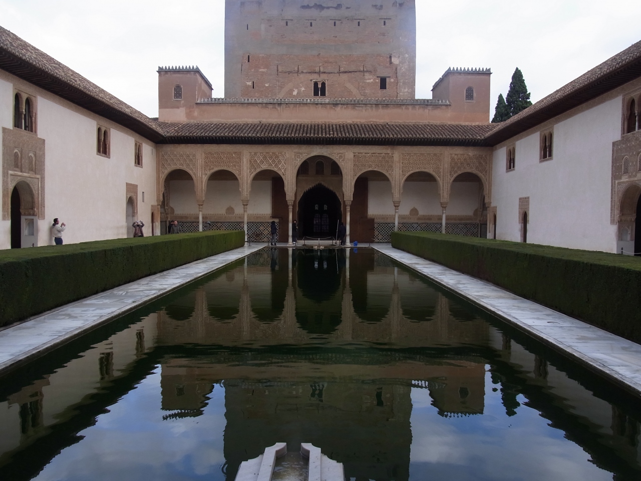 アルハンブラ宮殿の中のナスル朝宮殿、コマレス宮の中にアラヤネスの中庭があります。アルハンブラ宮殿の紹介ビデオなどでは必ずでてくる場面が見れます。細長い四角形の人工池に映り込む宮殿があまりにも素晴らしく晴れた日に訪れたかったのですが、曇りでした。それでも満足度は高いです。ここは観光客が多いので、朝一番に行くことをオススメします。