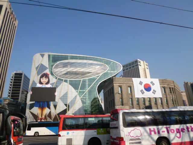 地下鉄1号線と2号線の乗換駅であるシチョン(市庁)駅を降りてすぐ目に飛び込んでくる湾曲したラインが特徴的な新しい市庁舎です。壁面にはフレンドリーな雰囲気を出そうとしたのか、女の子の巨大な壁画が描かれています。