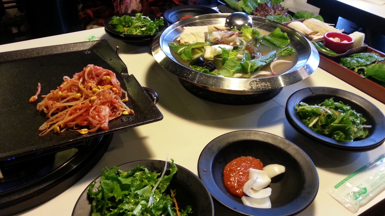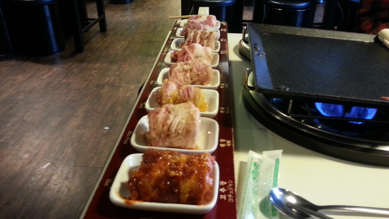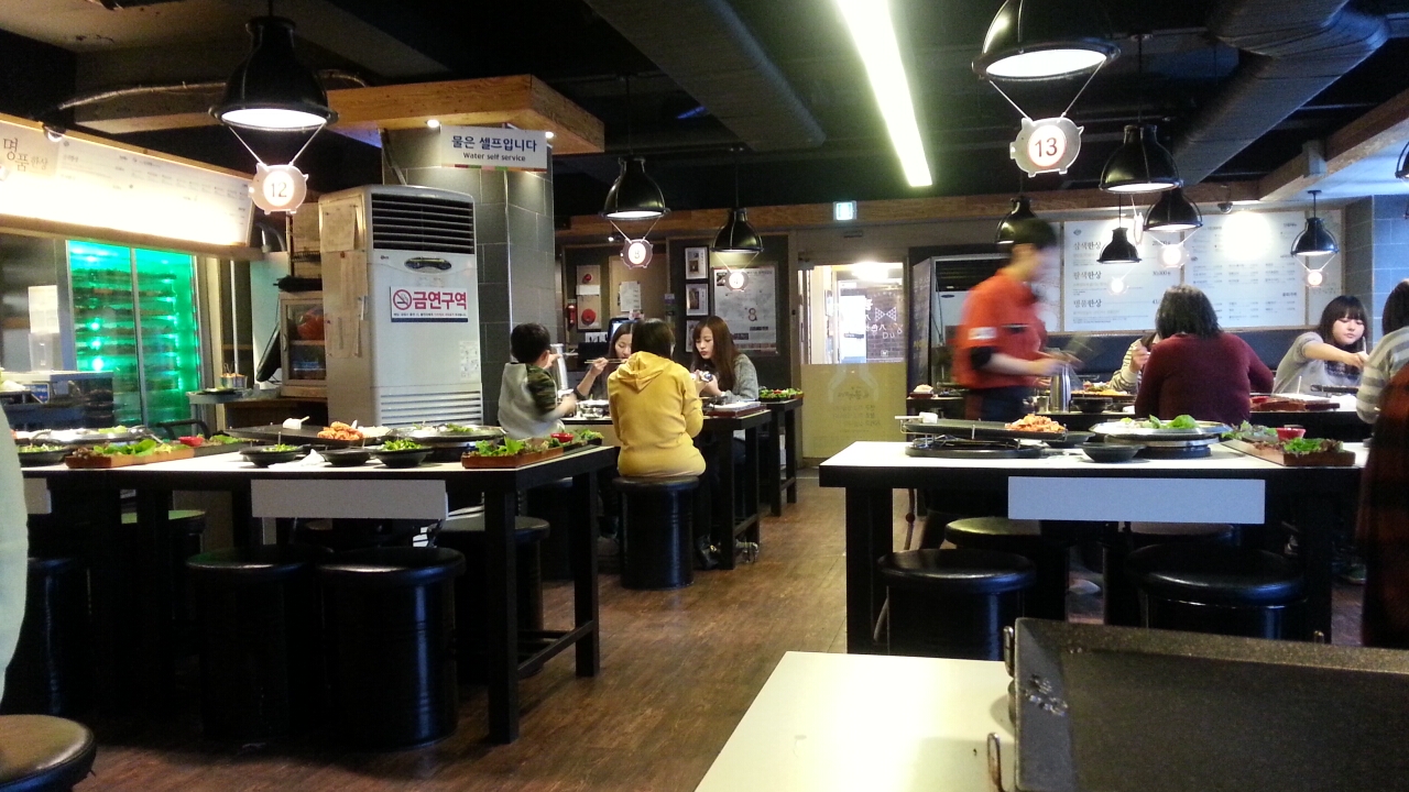 ここはお勧めです。八種類の肉(朝鮮人参・ニンニク・ワイン・カレー・ハーブなどの味付け)で3万ウォン、三人で9万ウォン(一万くらい)ならいいかと注文して、会計したらなんと39000ウォン!ビールを飲んで4000円くらいでした。
