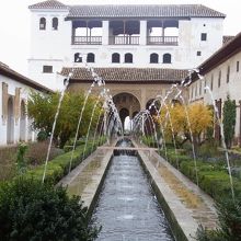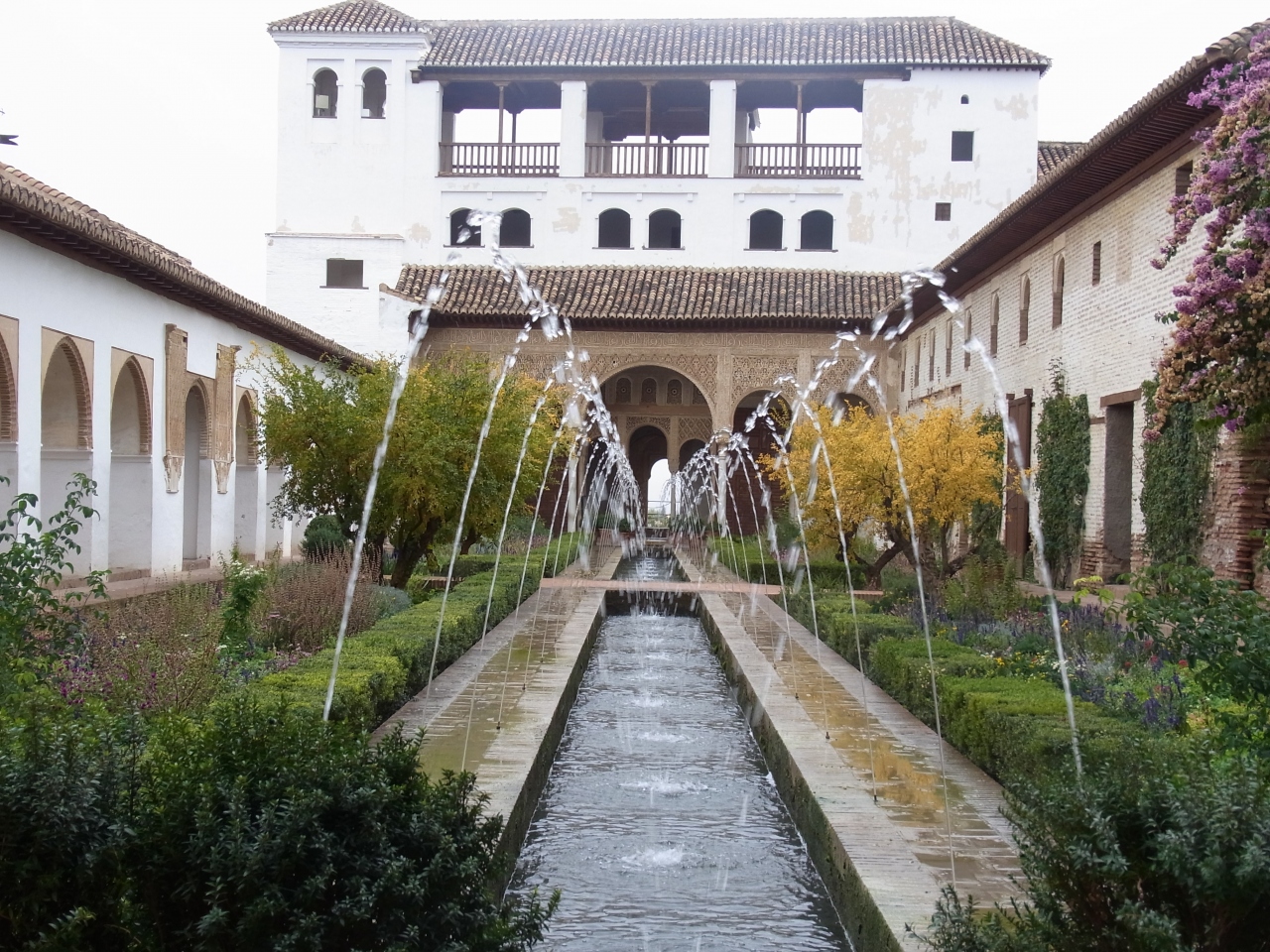 アルハンブラのヘネラリフェ庭園の一番奥にアセキアの中庭があります。イスラム・スペイン様式を代表する庭園です。50メートル程の細長い池を囲んで花々や緑が広がり、何本もの噴水の水しぶきが実に涼やかで、この地方の暑い夏にはさぞや涼しく安らぎをもたらしてくれたことでしょう。