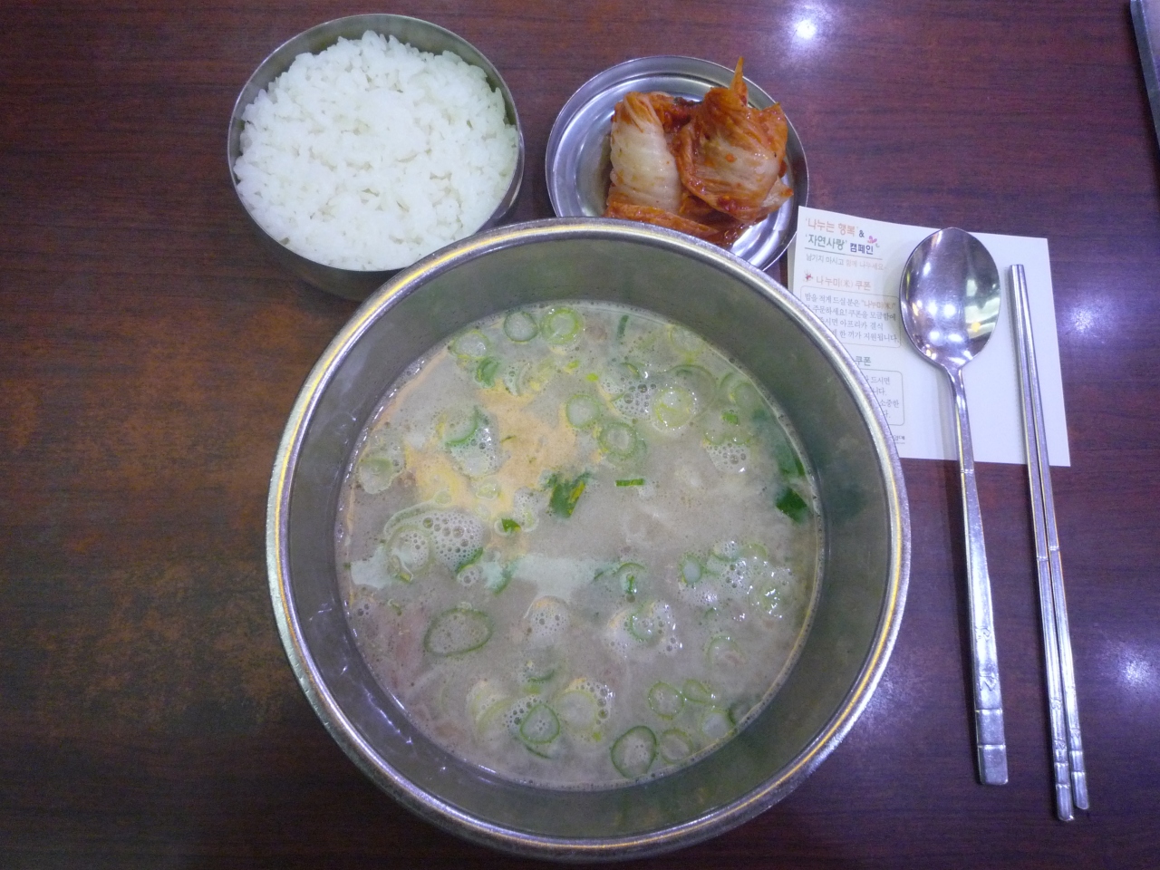 味は薄味ですが、スープにはコクがありました。最後の方には、塩やキムチを入れて味に変化をつけて食べました。