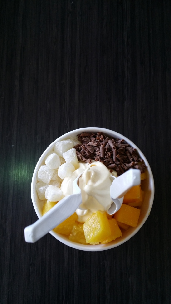 帰りのホノルル空港内で食べました。英語で注文するのに緊張しました。モチ、マンゴー、チョコレートを選んで乗っけてもらいました。ヨーグルトの種類が色々あって迷いましたが、オリジナルを選びました。かなり美味しかったです。