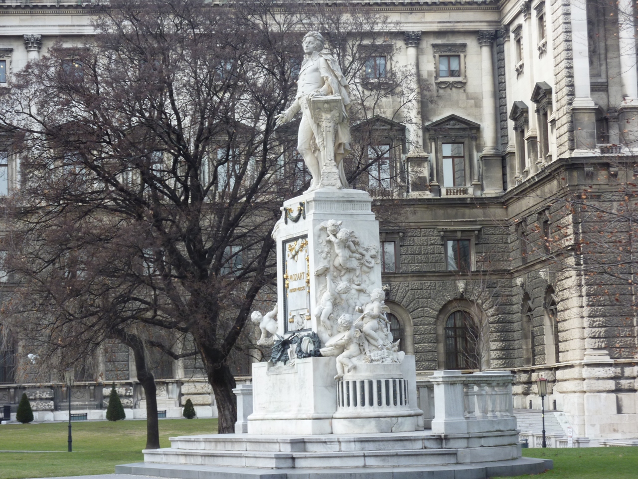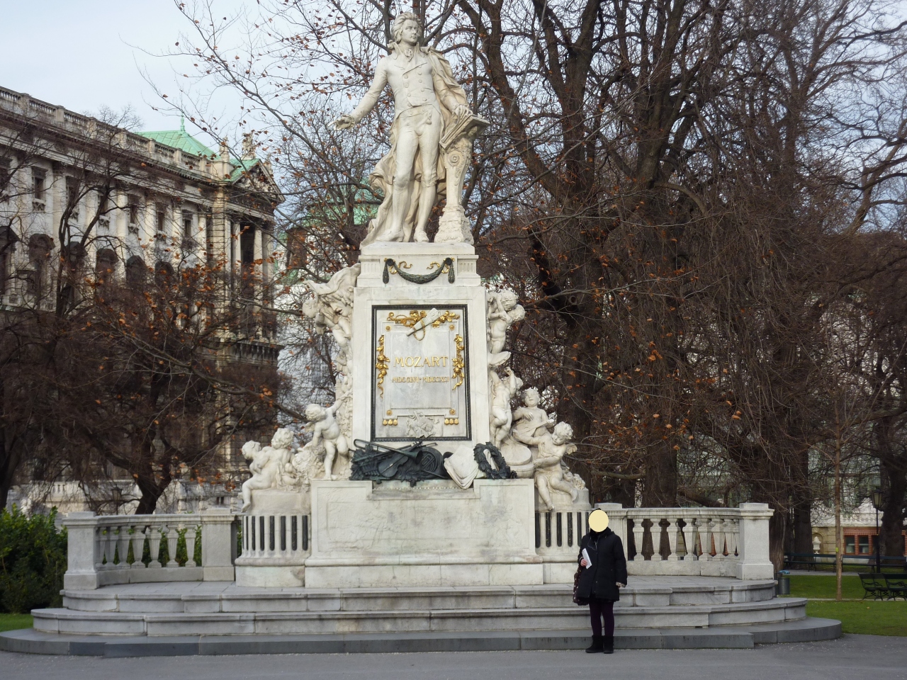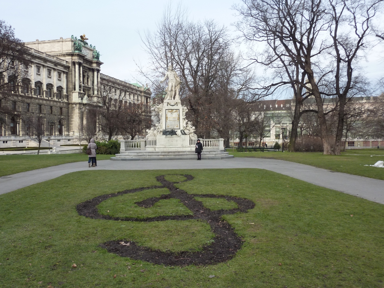 オペラ座前からリンクに沿って歩くと王宮の手前にブルク公園があり、その一角にモーツアルト像があります。道路からでは柵越しになります。像の前の芝生には大きなト音記号があり、夏には花壇になります。
