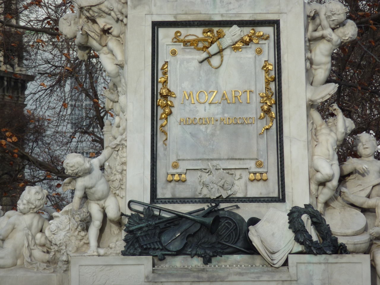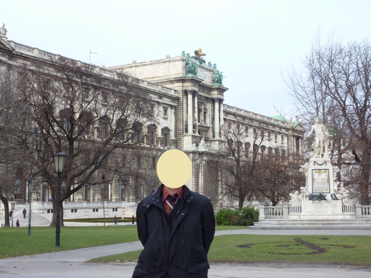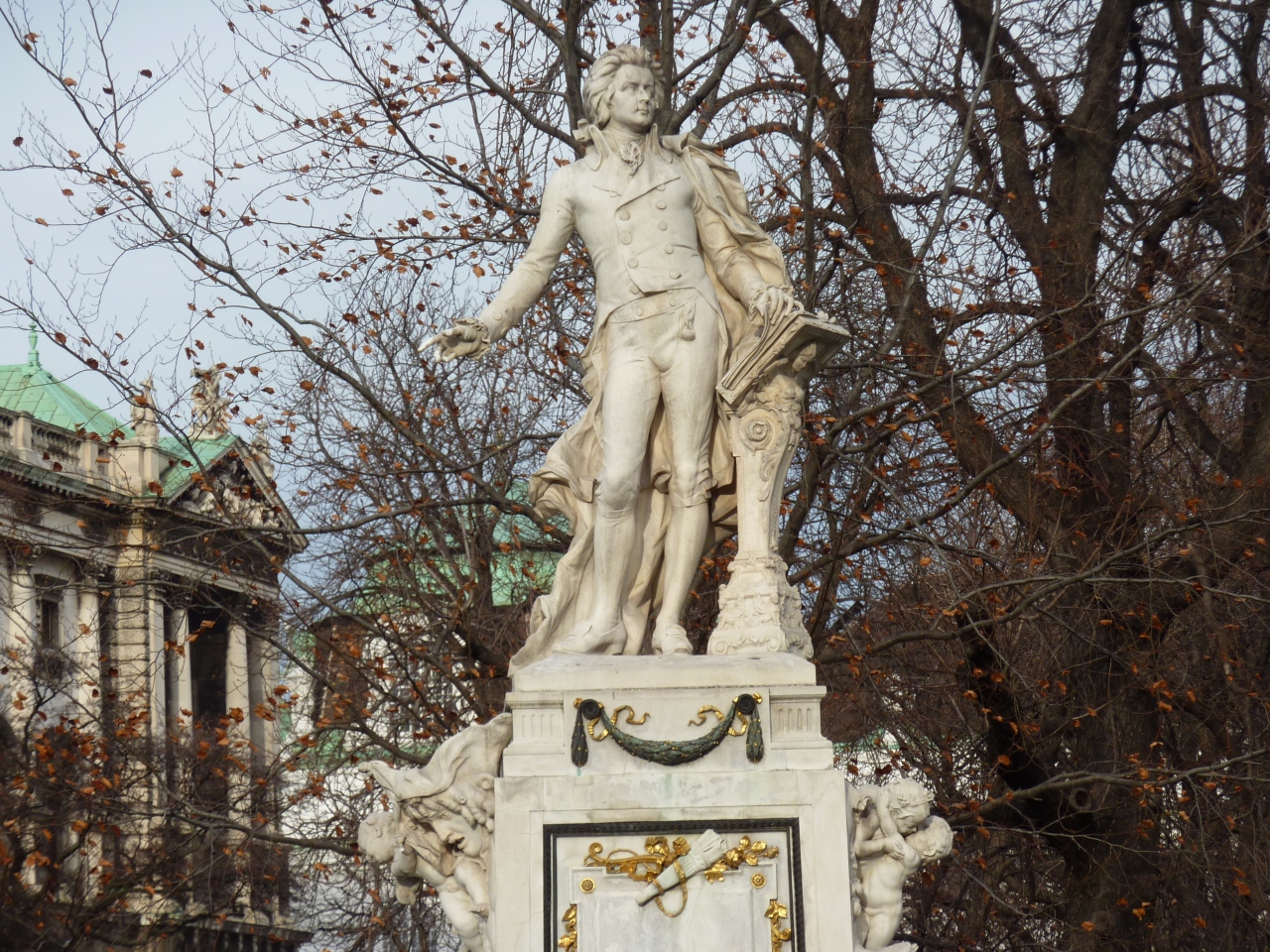 オペラ座前からリンクに沿って歩くと王宮の手前にブルク公園があり、その一角にモーツアルト像があります。道路からでは柵越しになります。像の前の芝生には大きなト音記号があり、夏には花壇になります。