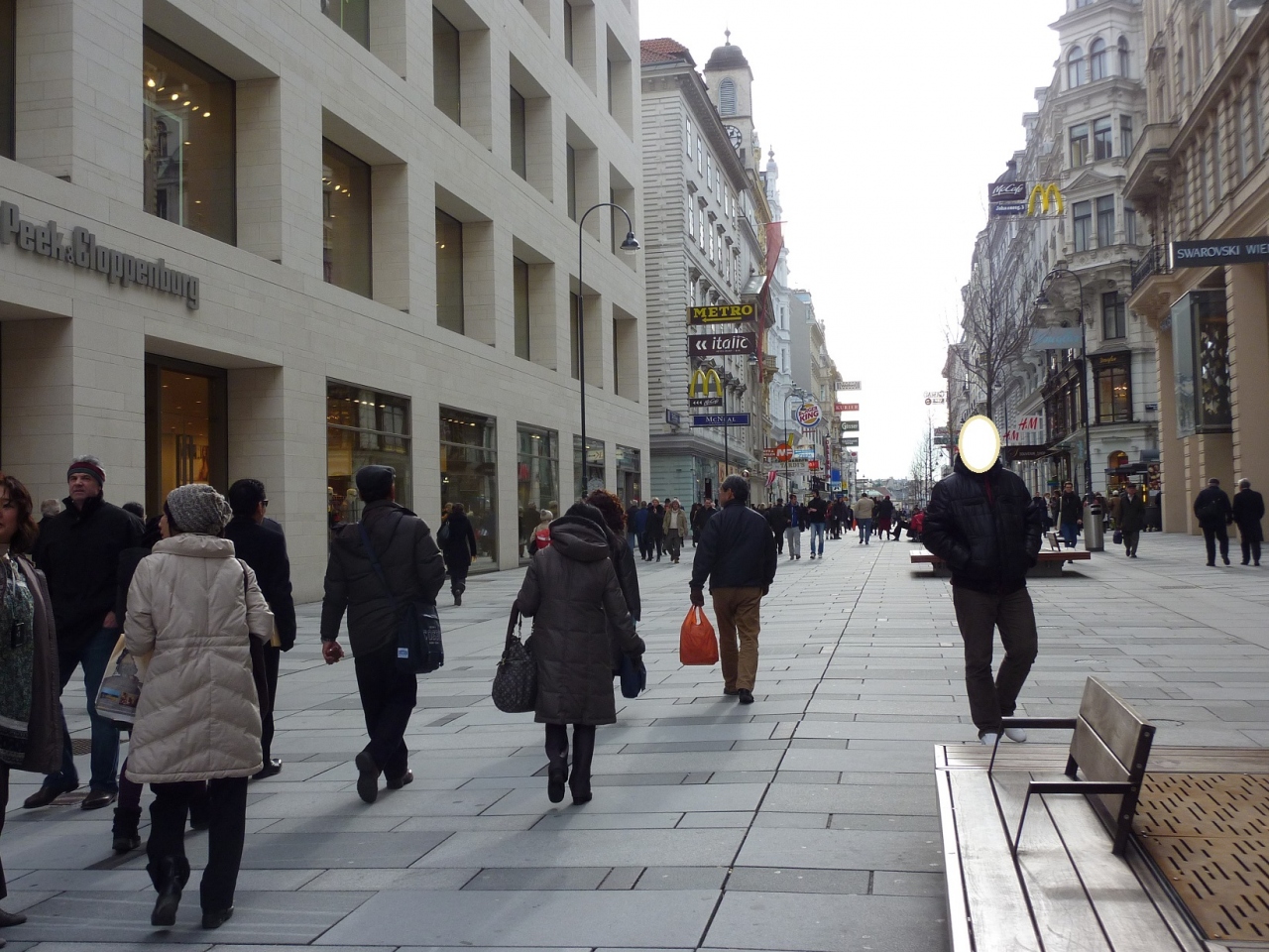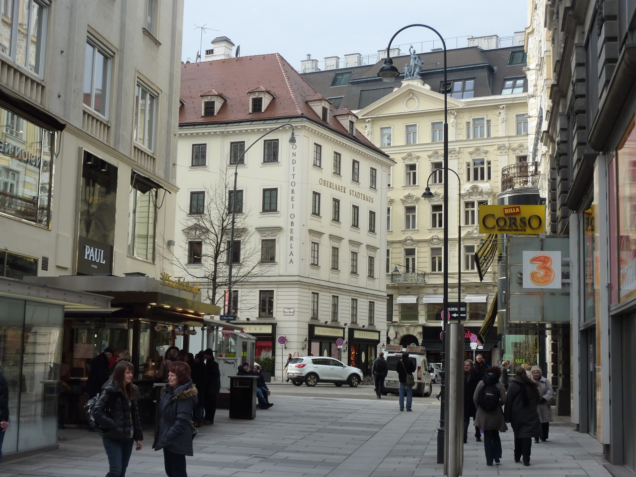 シュテファン広場からオペラ座方面に伸びるウィーン随一の繁華街で、道の両側にはカフェやショップ、ホテルなどが立ち並んでいます。終日歩行者天国で、車の心配なく、歩きやすい舗道になっています。所どころにベンチがあり、彫像も置かれていて、楽しく歩くことが出来ます