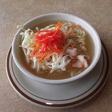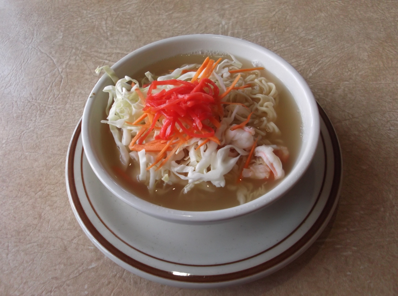なんてことは無い。普通のインスタントラーメンに紅生姜と千切りキャベツ、そして申し訳程度にエビをトッピングしただけですね。1度食べれば充分です。
