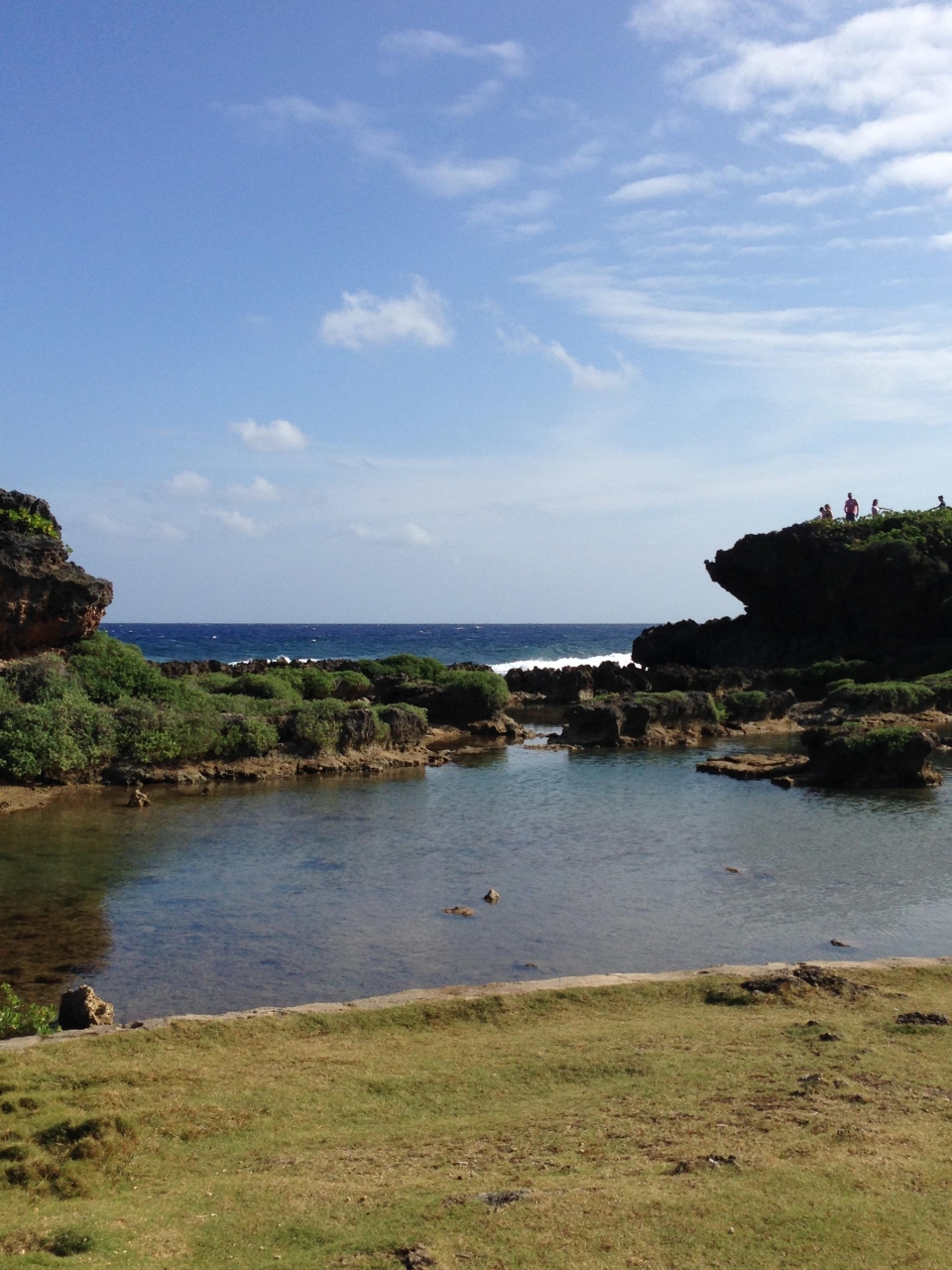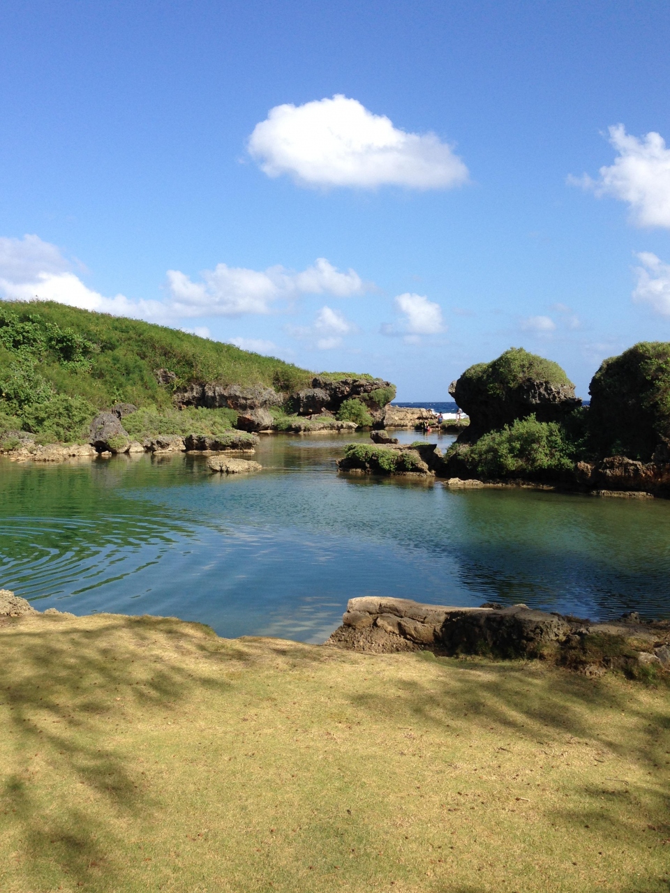 直径で20メートルくらいかしら?飛び込み台があるだけに、すぐ足がつかない深さになります。グアムの海はリーフがほとんどで、泳ぐには浅すぎるので、ここは気持ちよく泳げます。反対側は、リーフになっていて、そこは透明度も高くいろいろな魚やウミヘビ?も見えました。