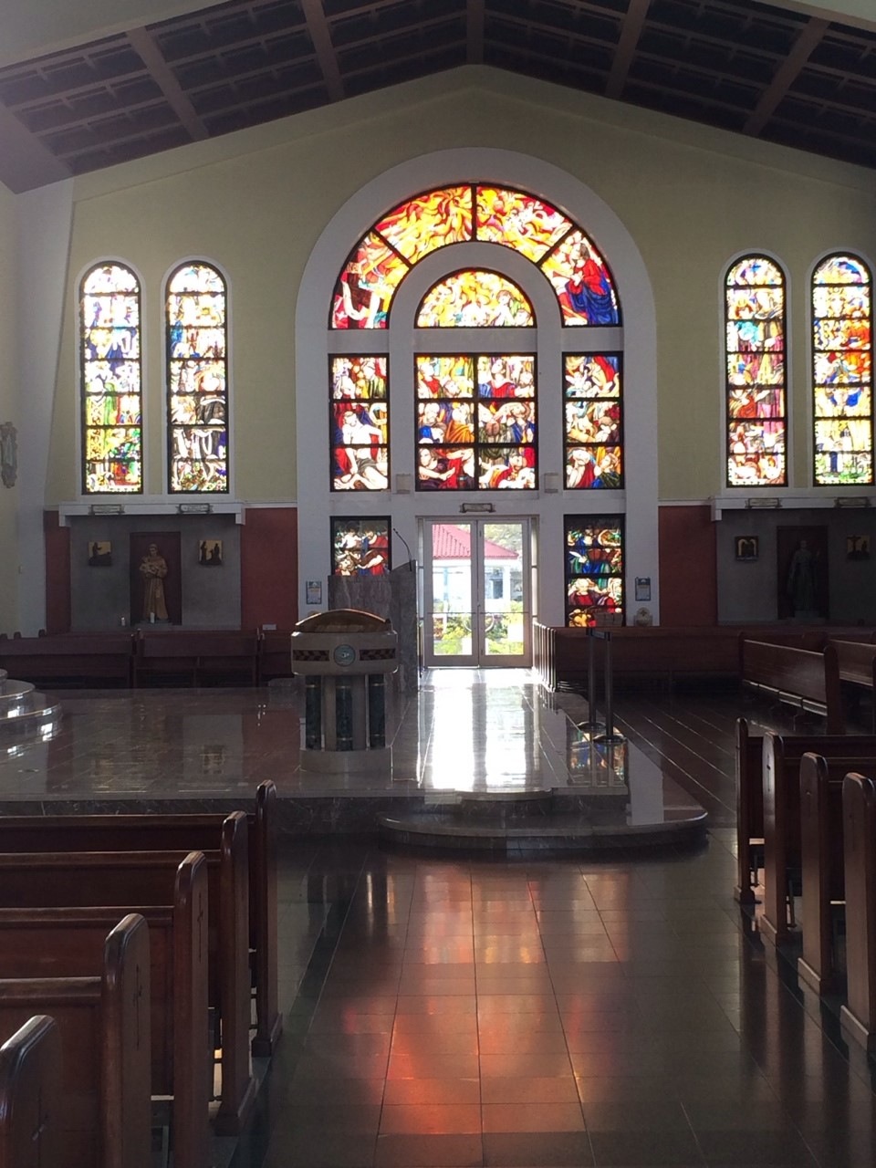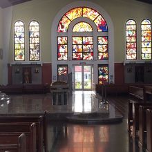 正面の入り口が透明ガラスのドアだったため、中をのぞいてみると、厳かな雰囲気の十字架が見え、一同、思わず手を合わせていました。