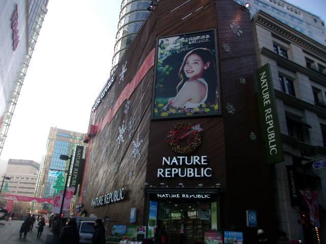 ネイチャーリパブリックは、直訳すれば”自然共和国”ということで、天然素材をベースにした美肌用の化粧品などを売りにしているショップで、明洞の中ではより高い世代に受けそうな、落ち着きのある雰囲気が売りのお店です。ワールド店に関しては、歩行者天国沿いの一番南寄り、ミリオレがあるブロックの北東角にあり、ウッディーな外観が天然素材をベースととした商品を扱っているお店らしい風情で、とても印象に残りました。