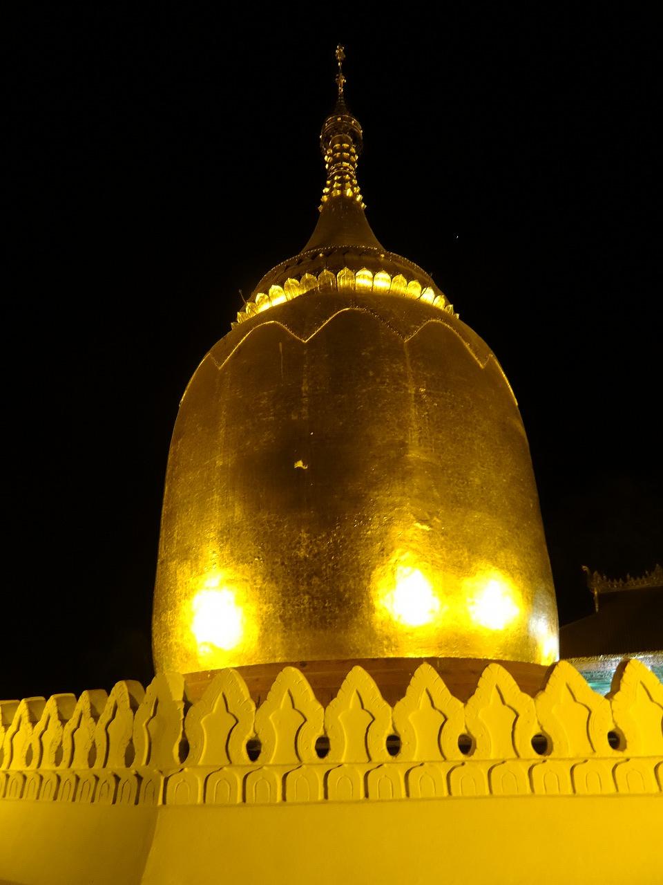 ★ミャンマー バガン 「プーパヤパゴタ」のライトアップ 川岸に立つ、円筒形の黄金のパゴタです。テラスには、夕食持参の地元の方々が、円座を組んで夜を楽しんでいらっしゃます。夜のライトアップされた姿、テラスから見る、エーヤワディー川の夜も幻想的です。ここは、夜がお勧めです。
