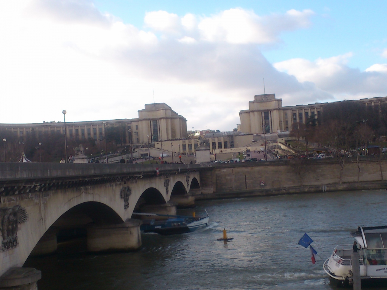 セーヌ川で、シャイヨー宮とエッフェル塔を結ぶ橋で、エッフェル塔側から川岸に降りると、観光船バスの乗り場があります。パリの万博博覧会に合わせて道幅が拡張されたそうで、とても道幅が広いです。石造りのアーチ橋で、横から見ると、とても綺麗な形をしています。