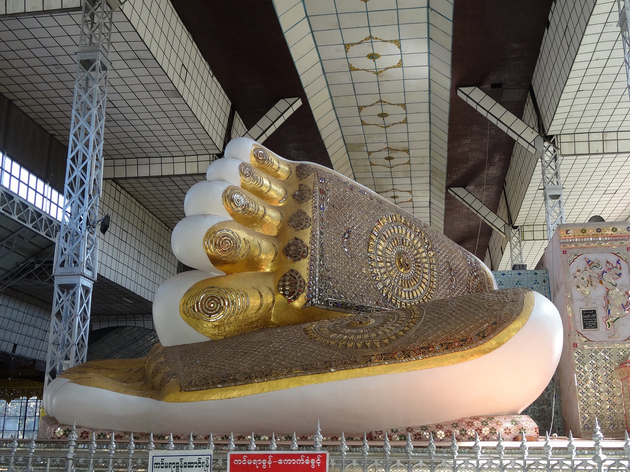 ★パゴー「シュエターリャウン寝仏 Shwethalyaung」全長55mの寝釈迦仏。994年にモン族のミガディバ王によって建立。バゴー王朝の滅亡ととともにジャングルの奥地に忘却されていたものを、英国植民地時代に鉄道敷設で偶然、発掘されました。全長55mの寝釈迦仏。足の裏は、仏足跡。108の升目の装飾が見事。足の裏は、7.7m。