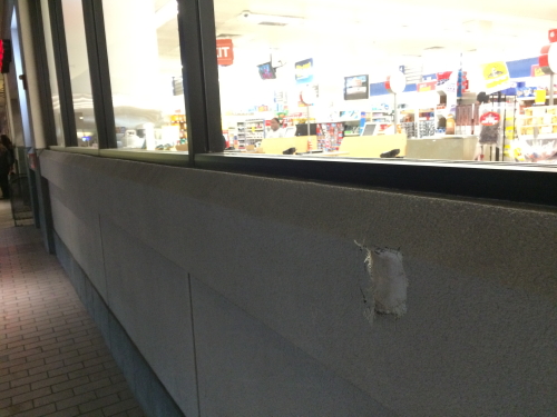 アラモアナセンターの西側、ロングスドラッグスの外側の壁に穴があいていたので、ちょっとのぞいてみたら・・・なんと壁の中は発砲スチロールでしたぁ~!!
