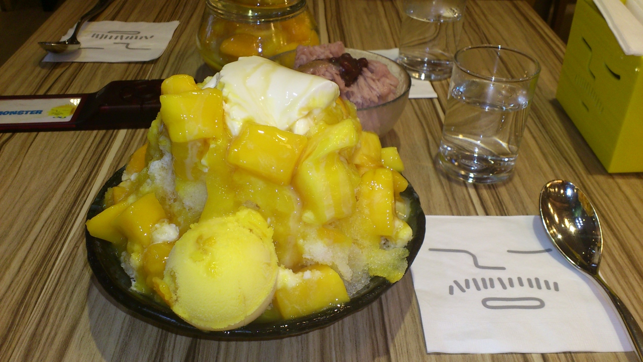 いつも並んでいる人気店とのことでしたが、平日の午前中に行くと、さすがにお客さんは少なかったです。カウンターで注文と支払いを済ませ、フードコートで使用するような呼び出し用のマシーンを受け取って着席。店内は広くて、オシャレで、奥にはいろんなタイプのソファ席がありました。メニューもいろいろありましたが、ここはやはり定番のマンゴーかき氷を注文。しばらくすると、「待っている間にどうぞ。」って小豆のかき氷をサービスしてくれました。さらにかき氷っていうのは正直キツかったですが、そんなサプライズは嬉しかったです。その時は若い男性店員さんばかりでしたが、愛想も良く、テキパキと仕事をしていました。マンゴーかき氷は言うまでもなく、量も味も満足のいくものでした。