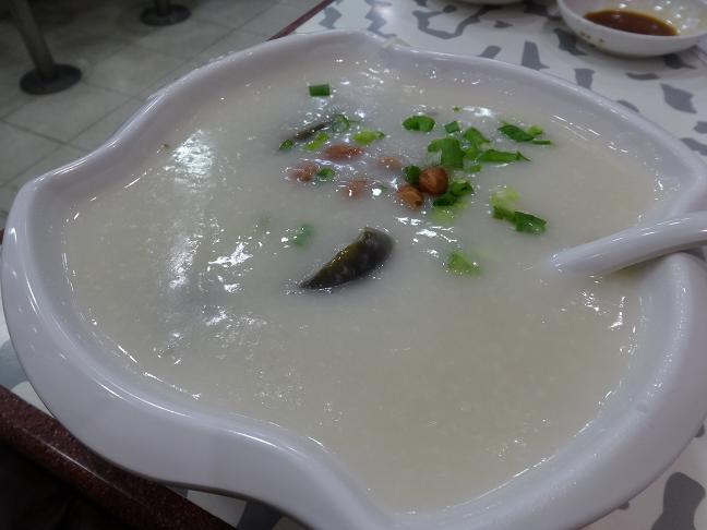 ワンチャイの店に行きました。土曜日の午後2時過ぎに行ったのですが満席でしばらく待って着席できました。注文したのはピータン粥です。5分ぐらい待たされました。器が以前の丸型からおしゃれな形に変わっていました。お粥は米の形がわからないくらいどろどろしています。具はピータンのほかにピーナッツ?とねぎだけのシンプルなものでしたが、塩味がちょうどよい加減でおいしかったです。見た目よりも食べ応えがありました。この店にはお粥のほかに油条という揚げパンや腸粉、焼きそばなどのサイドオーダーも充実しています。香港ではお粥と豆乳を一緒に頼む人が多いです。メニューを見ると平日の2時半からお得なセ ットメニューがあるようでした。