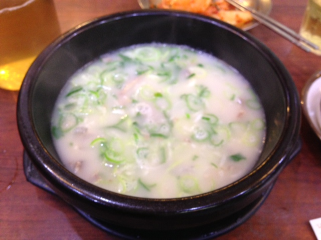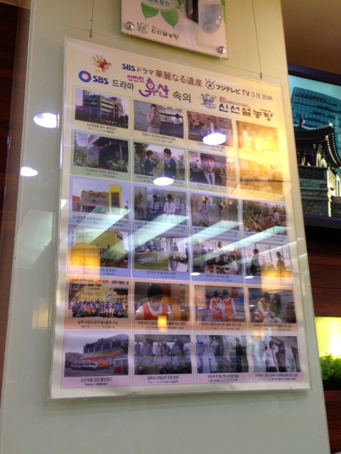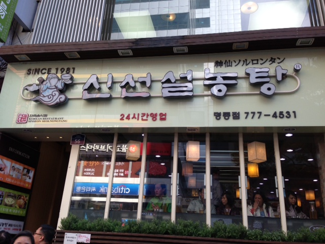 明洞にあるチェーン店。ソルロンタンのお店は庶民的なお店が多いのですが、ここはかなりオシャレというか、ファーストフード店のようにすら見えます。お昼を過ぎても結構並んでいますが、回転が速いので、そう長く待つことはありません。ソルロンタンは700ウォンからで、肉の量が多いもの(1300ウォン)などもある。近くにある老舗の河東館と比較して、あらかじめ味がある程度ついており、まずは先に食べてから、味を調えた方がよいです。アツアツで、コラーゲンがたっぷり。キムチやカクテキが食べ放題で、自分で好きな大きさにハサミで切る。カクテキは酸味があって美味しい。日本語のメニューや1人客用のカウンター席もあり、一人で食事が難しい韓国では貴重な存在です。本社が、イ・スンギとハン・ヒョジュ主演で、フジテレビでも放送されたSBSテレビのドラマ『華麗なる遺産』の舞台にらなったそうで、そのポスターがやたら貼ってあった.