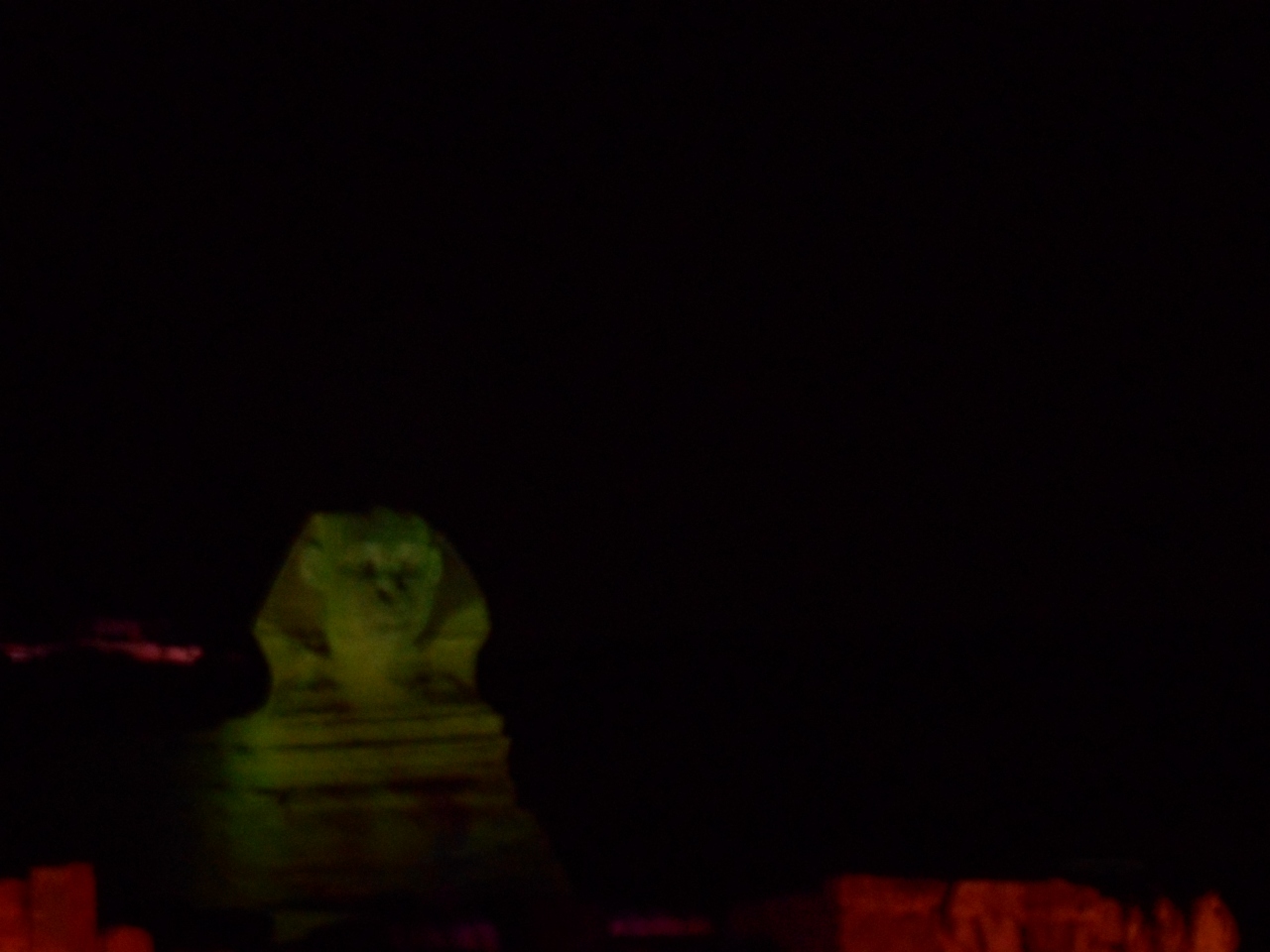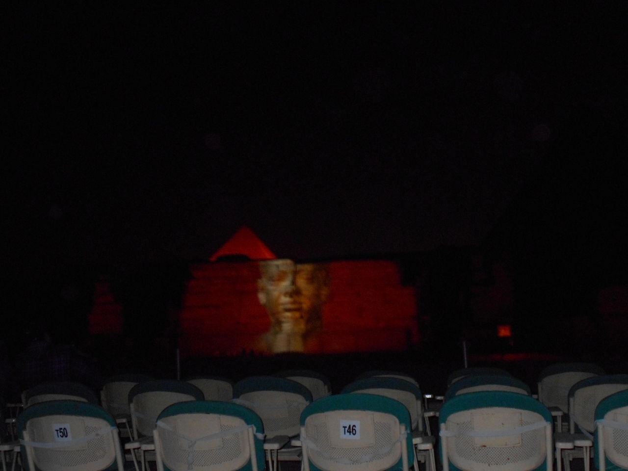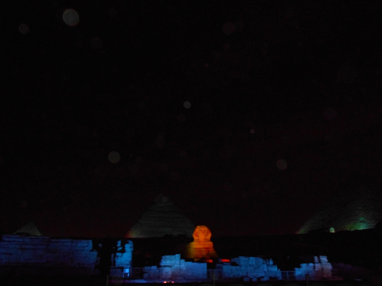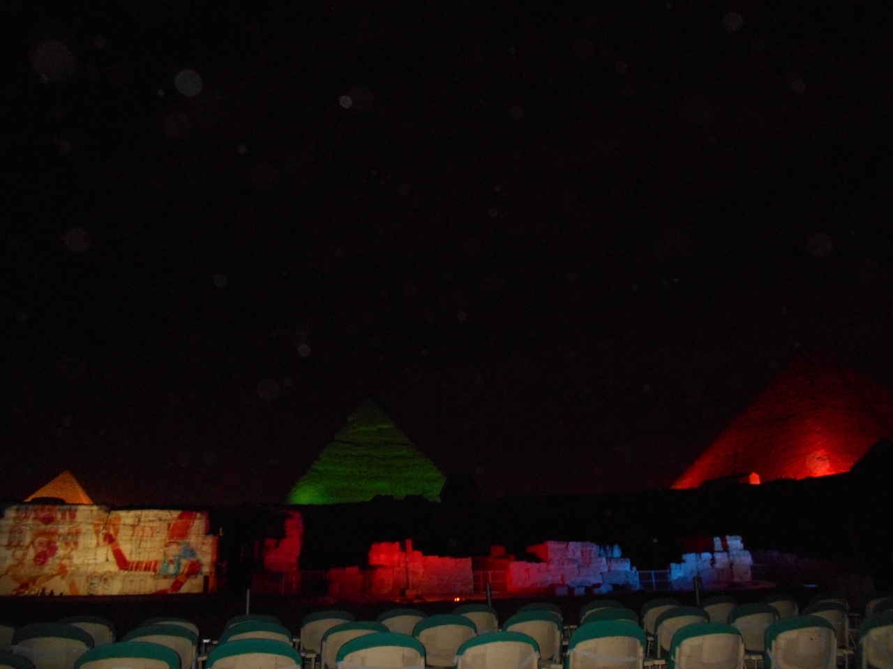 三大ピラミッドとスフインクスを背景に光と音で奏でるナイトショーを見ました。ギザの三大ピラミッドとスフインクスとその前にある遺跡に赤や青そして緑のカラーライトが当てられ幻想的なシーンを作っていきます。また、ツタンカーメン王など、投影やレーザーグラフィックスにより「太陽の船」なども描きながら、エジプト古王朝時代の物語が語られていきます。日本人用に無線を使用した日本語のナレーションもあり、そのストーリーも楽しむことができました。観客席はピラミッドから少し離れたところにあり、全体が見渡せ、雄大で幻想的な雰囲気を味わうことができました。ただ、問題はとても寒いことです。一月、日本の寒さで慣れているとはいえ、昼夜の寒暖さが大きく防寒の備えが必要でした。