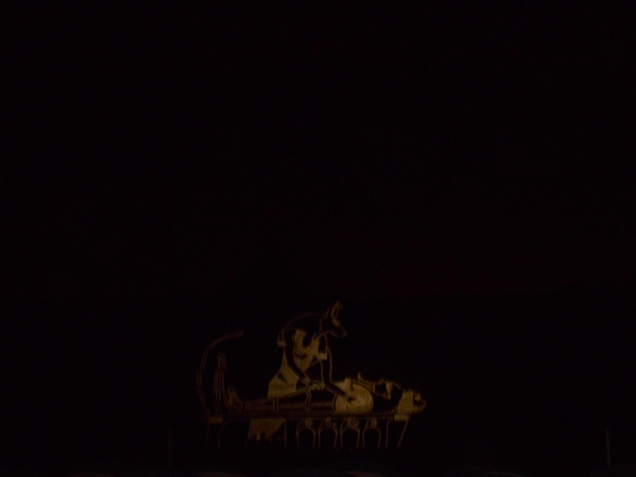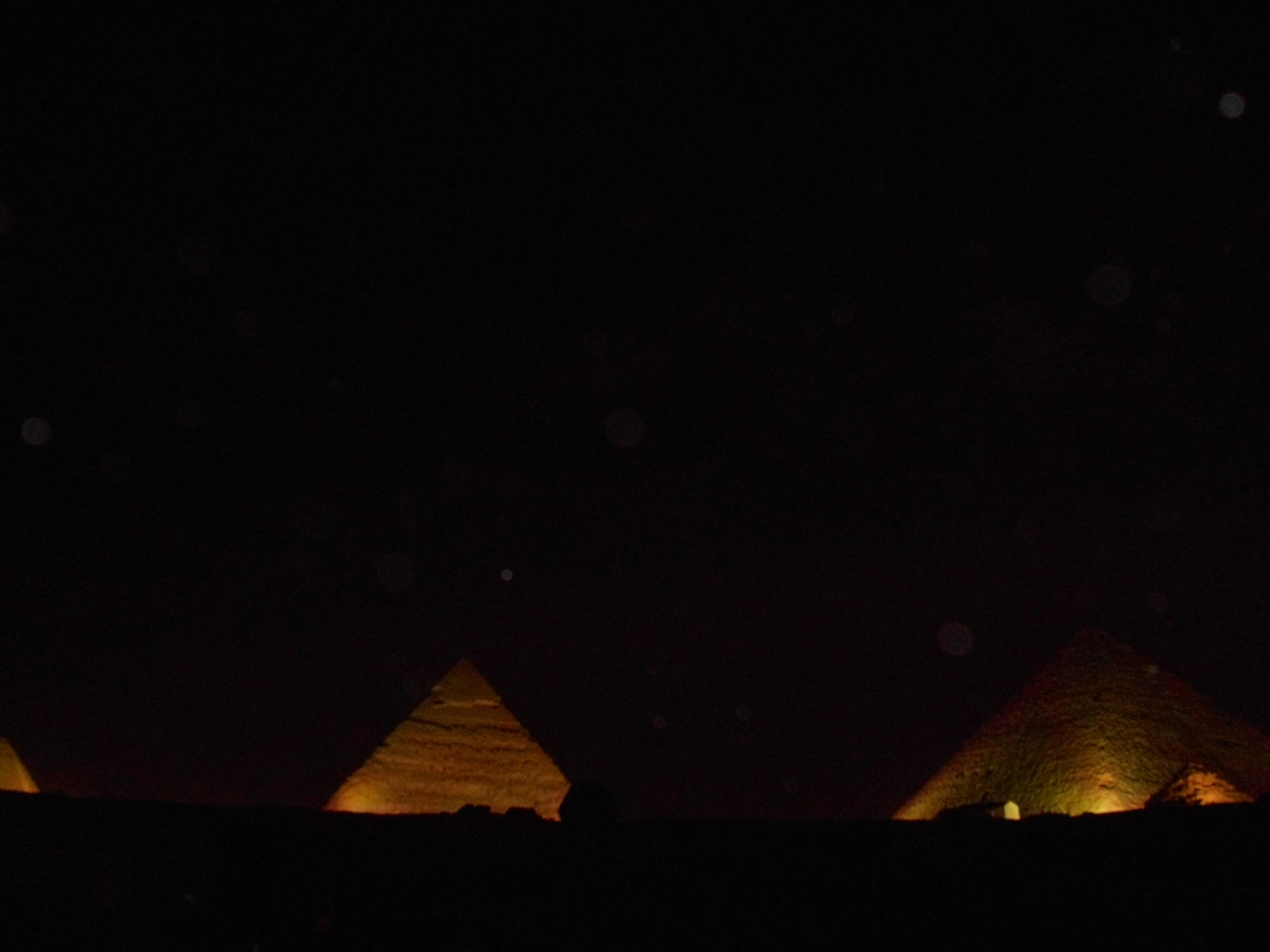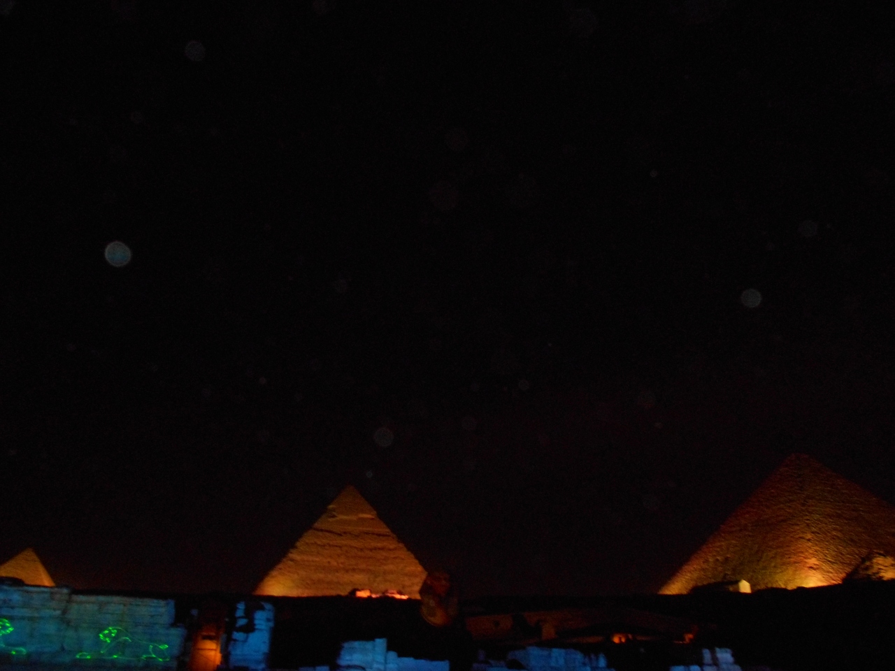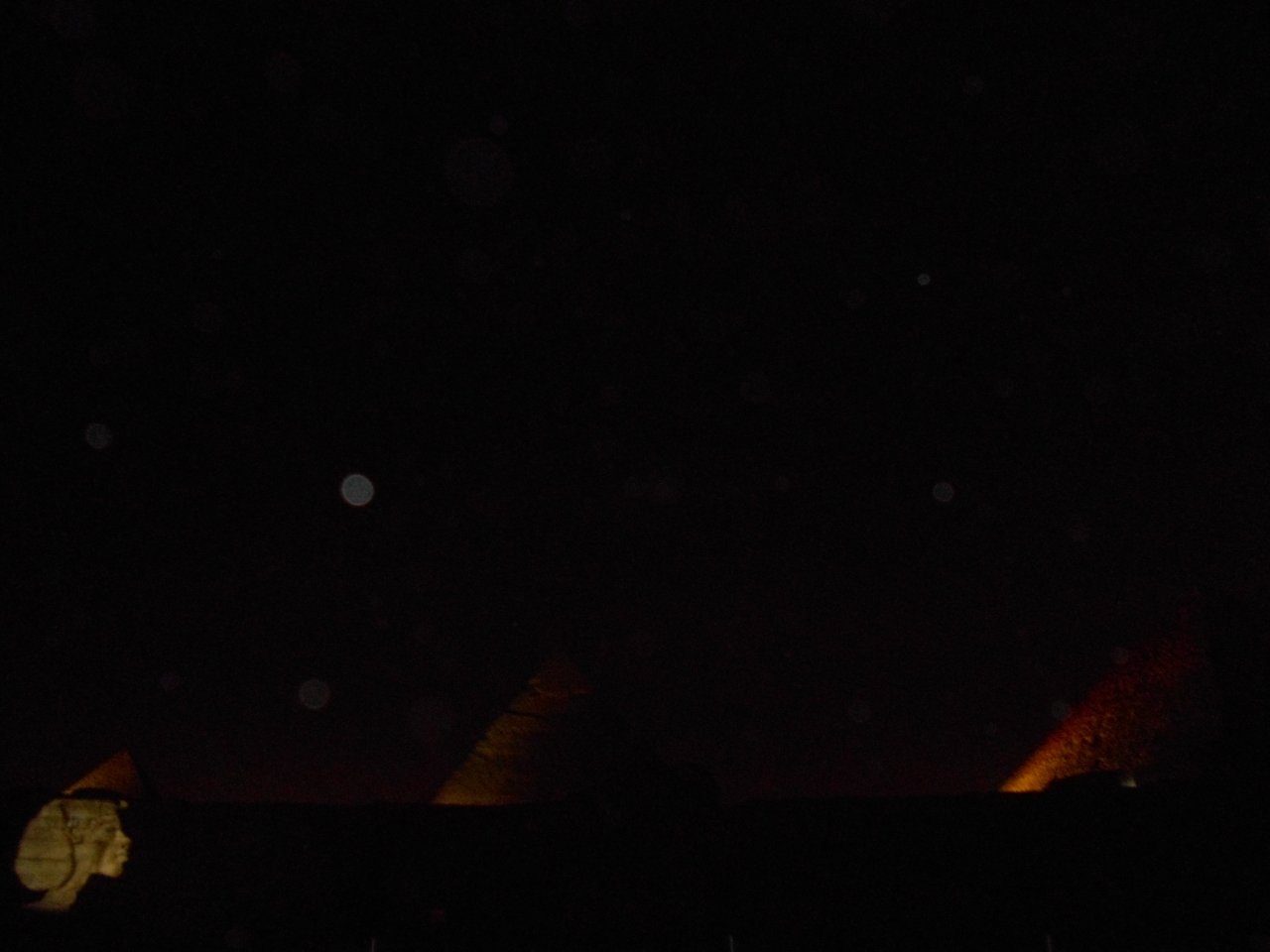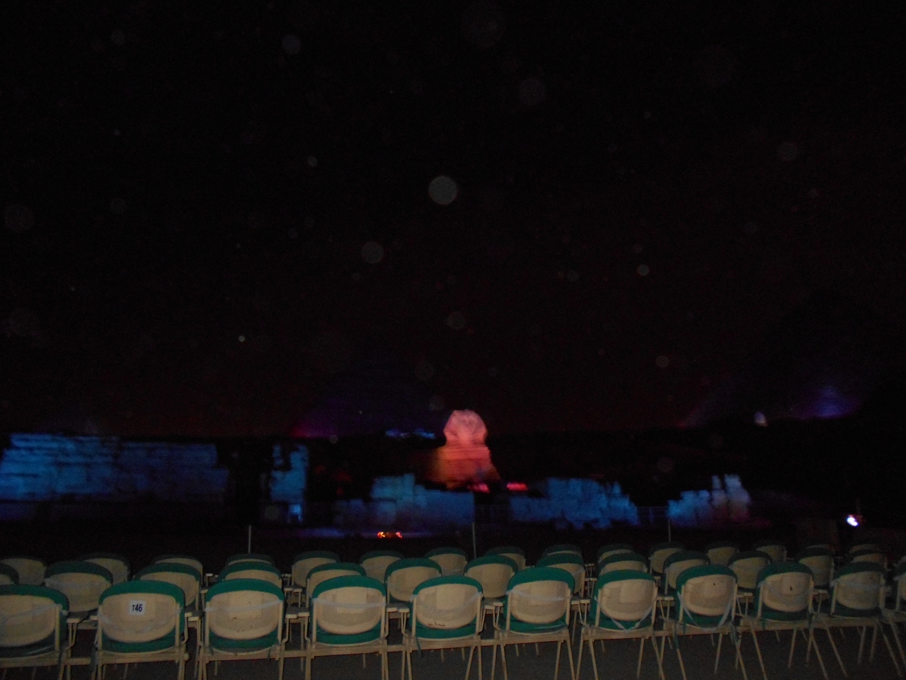 三大ピラミッドとスフインクスを背景に光と音で奏でるナイトショーを見ました。ギザの三大ピラミッドとスフインクスとその前にある遺跡に赤や青そして緑のカラーライトが当てられ幻想的なシーンを作っていきます。また、ツタンカーメン王など、投影やレーザーグラフィックスにより「太陽の船」なども描きながら、エジプト古王朝時代の物語が語られていきます。日本人用に無線を使用した日本語のナレーションもあり、そのストーリーも楽しむことができました。観客席はピラミッドから少し離れたところにあり、全体が見渡せ、雄大で幻想的な雰囲気を味わうことができました。ただ、問題はとても寒いことです。一月、日本の寒さで慣れているとはいえ、昼夜の寒暖さが大きく防寒の備えが必要でした。