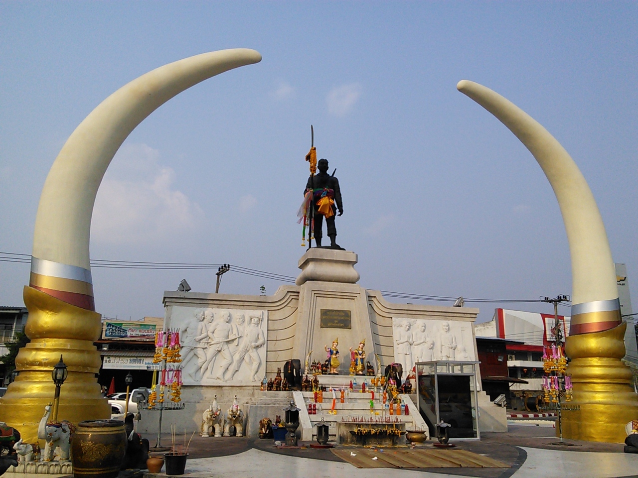 町の南外れ、ロータリーの中にある記念像です。1786年、クーイ族の首長であったスリン・パクディーが当時の首都アユタヤから脱走した神聖な白象を見事に捕獲した功績を讃えられこの町の初代領主に任命されました。これがスリンという町の名の由来になっています。この像は1984年に建てられました。像の両脇からのびる象の牙のオブジェの方が印象的で目立っています。