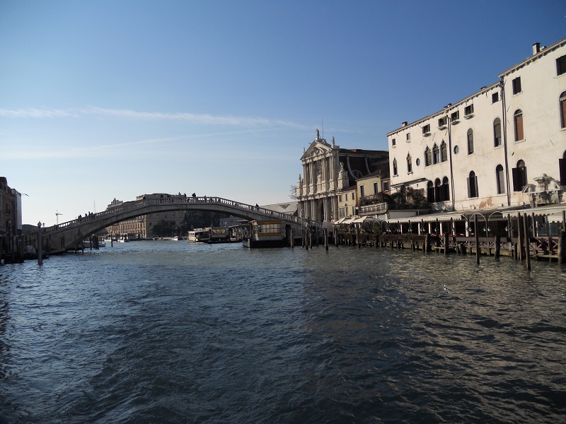 ヴェネツィアには、グランド・カナルにかかる橋は4つあって、一番有名なのは「リアルト橋」ですが、ヴェネツィア観光の陸路での玄関でもあるサンタ・ルチア駅から街歩きやヴァポレットに乗って観光をスタートした場合は、一番最初に見えるのがこちらの橋です。ヴァポレットの外に出て撮影しましょう。