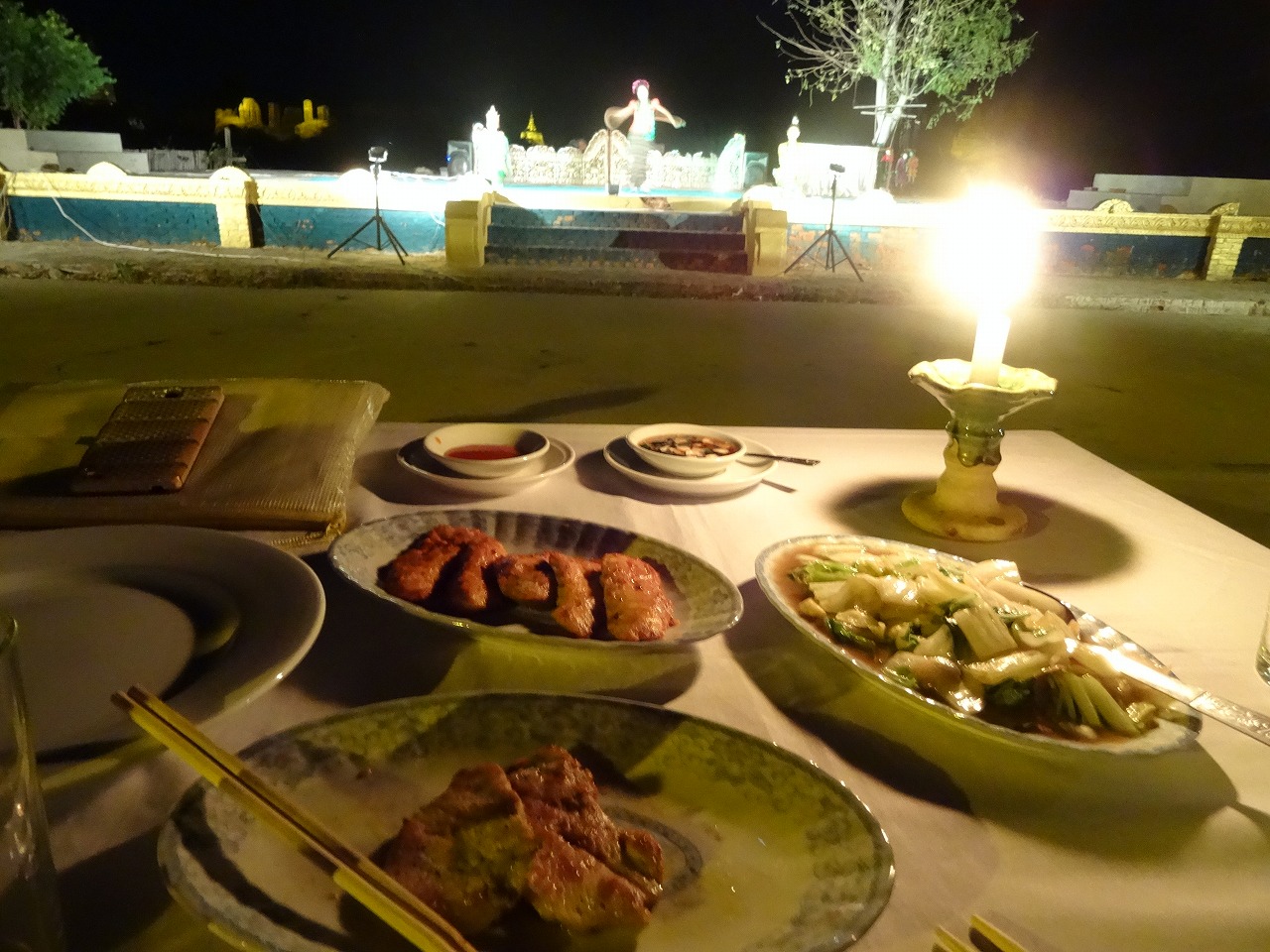 クイーンハウスレストラン (Queen House Restaurant)背景にライトアップされたパゴタを見ながらの大きな舞台を備えた、ミャンマー料理のレストランです。本格的なミャンマー舞踊と操り人形の舞台を見ることができます。料理の味は、まあまあかな?お客筋は、外国人の観光客です。