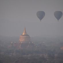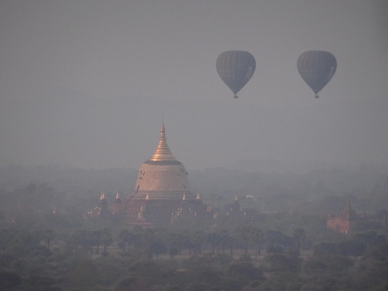 ★「ダマヤッズィカ パゴダ (Dhammayazika Pagoda)」写真は、バガンタワーから見た、朝もやのなかの「ダマヤッズィッカ・パゴタ」。オールドバガンの寺院群からは少し離れています。シュエズィーゴンパゴタに似て、堂々たる姿です。台座が5角形で、その各辺に入口、小さな寺院が立てられ、均整がとれたつくりとなっています。