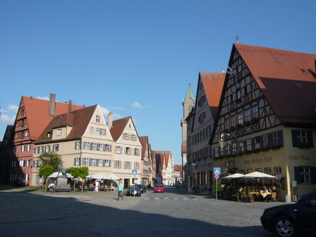広場というよりは、道路が交差して広くなっているところのように見えます。マルクト広場の北側の華麗な五軒の切妻のある家が並んでいるところがワインマルクト。左から繊細な鐘楼と大時計がある「市参事宴会場」、段上破風のある「パトリシアハウス」、三軒目が「ドイッチェス・ハウス」、一番奥にオベリスク装飾の螺旋状の切妻を持つ「シュラネン」穀物倉庫です。