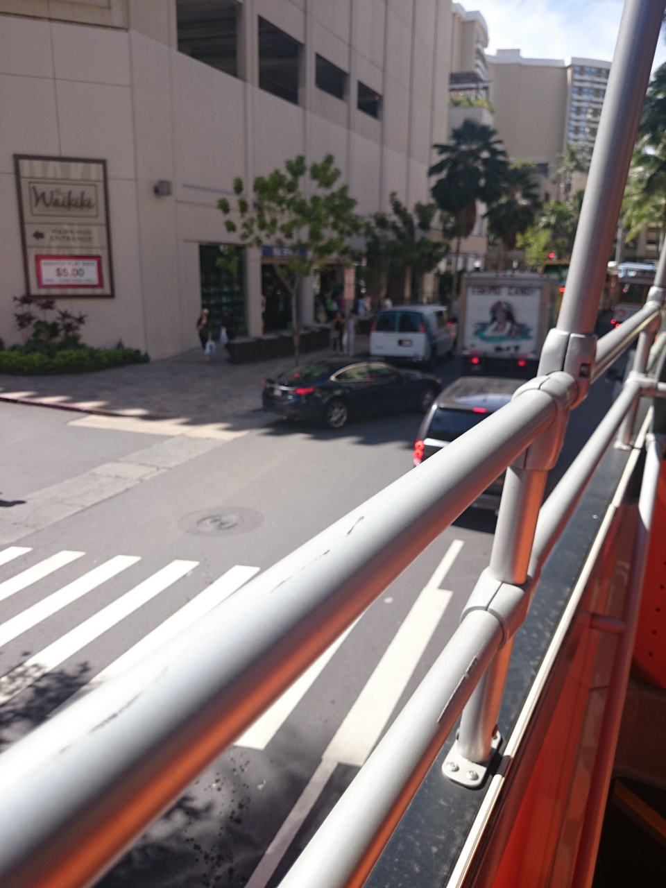 行きはJALパックのトロリーが何台も何台も来ても待てども待てどもワイキキトロリーのピンクラインが来なくて乗車客の長い列が出来ましたが、4年前にはなかった2階建ての大型トロリーが到着して沢山の乗客を一気に乗せることができました。