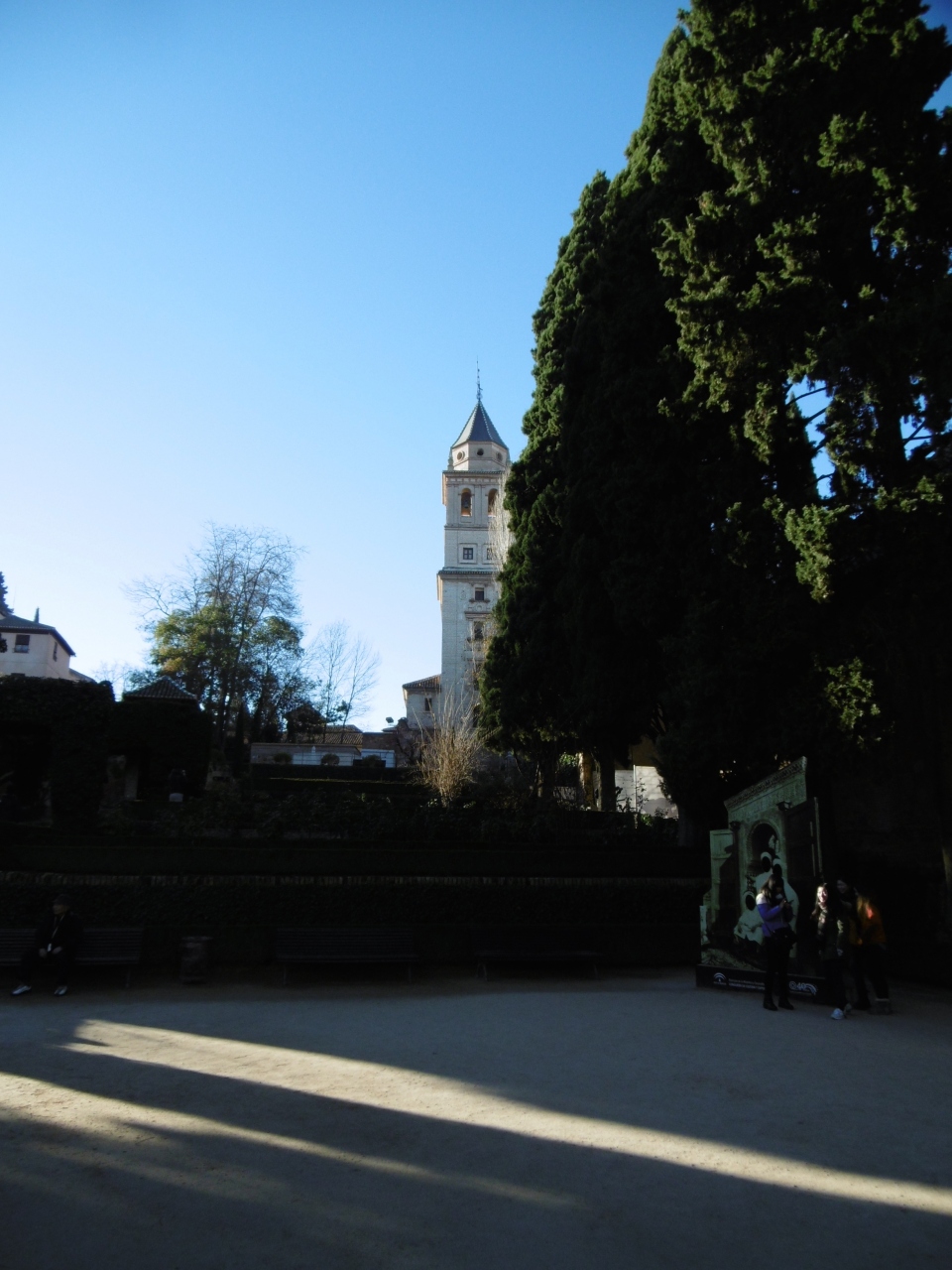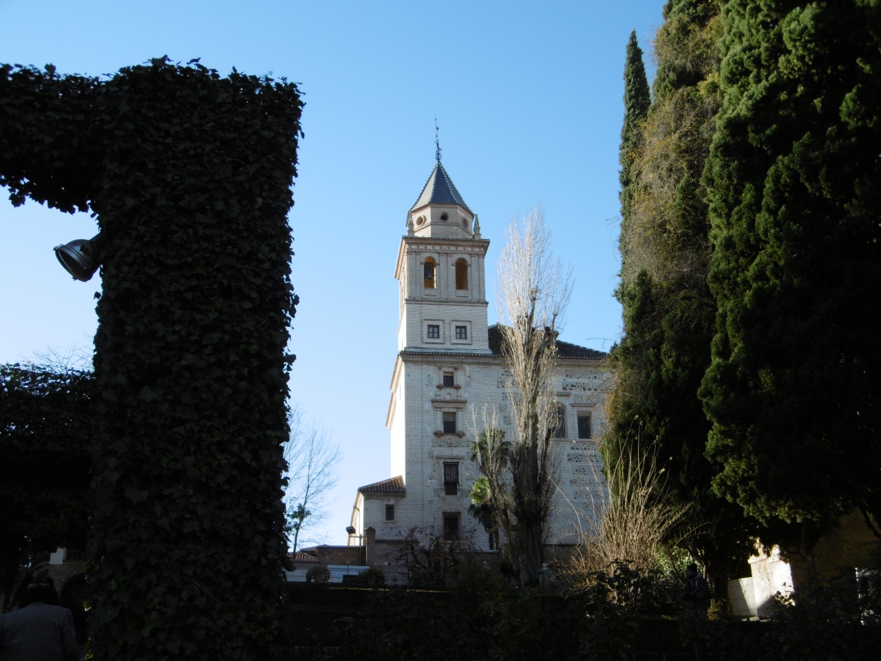 パラドールやホテル アメリカの北側に広がって、貴婦人の塔と池や剪定された植物が美しい庭園です。