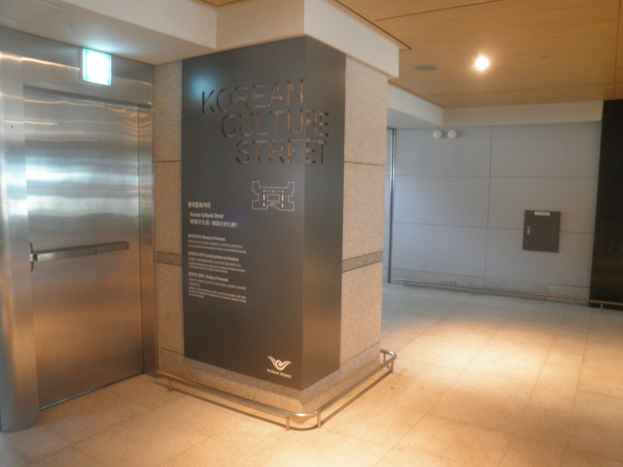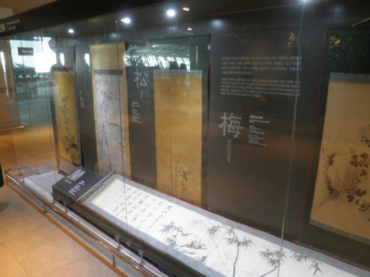仁川国際空港で乗り継ぎ時間があったので、空港ビルを散策しました。 出国後にある仁川空港伝統文化体験館は短い時間で韓国文化ができる施設です。 出国する前ににも、出国口の上の階に、韓国文化通りといういくつか韓国文化を紹介する展示があります。 書や陶器などが展示されていました。 ここの展示フロアーからは、免税店が並んだ通路を眺めることができました。