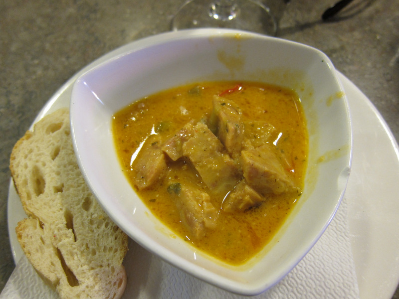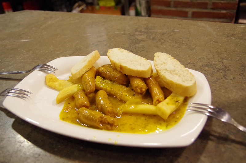 同行約1名が二日酔いのため水を注文したら、なんと水でもタパスが出てきた。鶏肉のカレー風味煮込みとでも言うか、白いご飯にかけたら美味しそうなもの。
