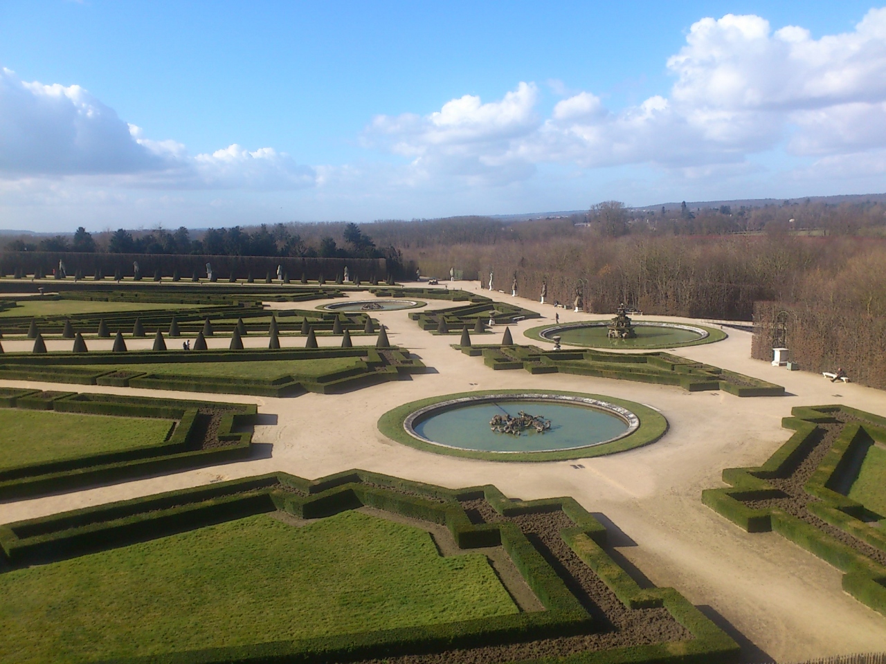ベルサイユ宮殿の地図を見ると、宮殿の裏側に広大な庭園が広がっています。まず最初にベルサイユ宮殿を見学したのですが、それだけで見どころがたくさんあり、その後に庭園に出た時には、庭園全体を見る元気がありませんでした。宮殿の後ろには、2つの噴水があるのですが、片方は完全に水が抜かれていて、少し興ざめでした。しかし、庭園の一部しか見ませんでしたが、迫力は十分でした。