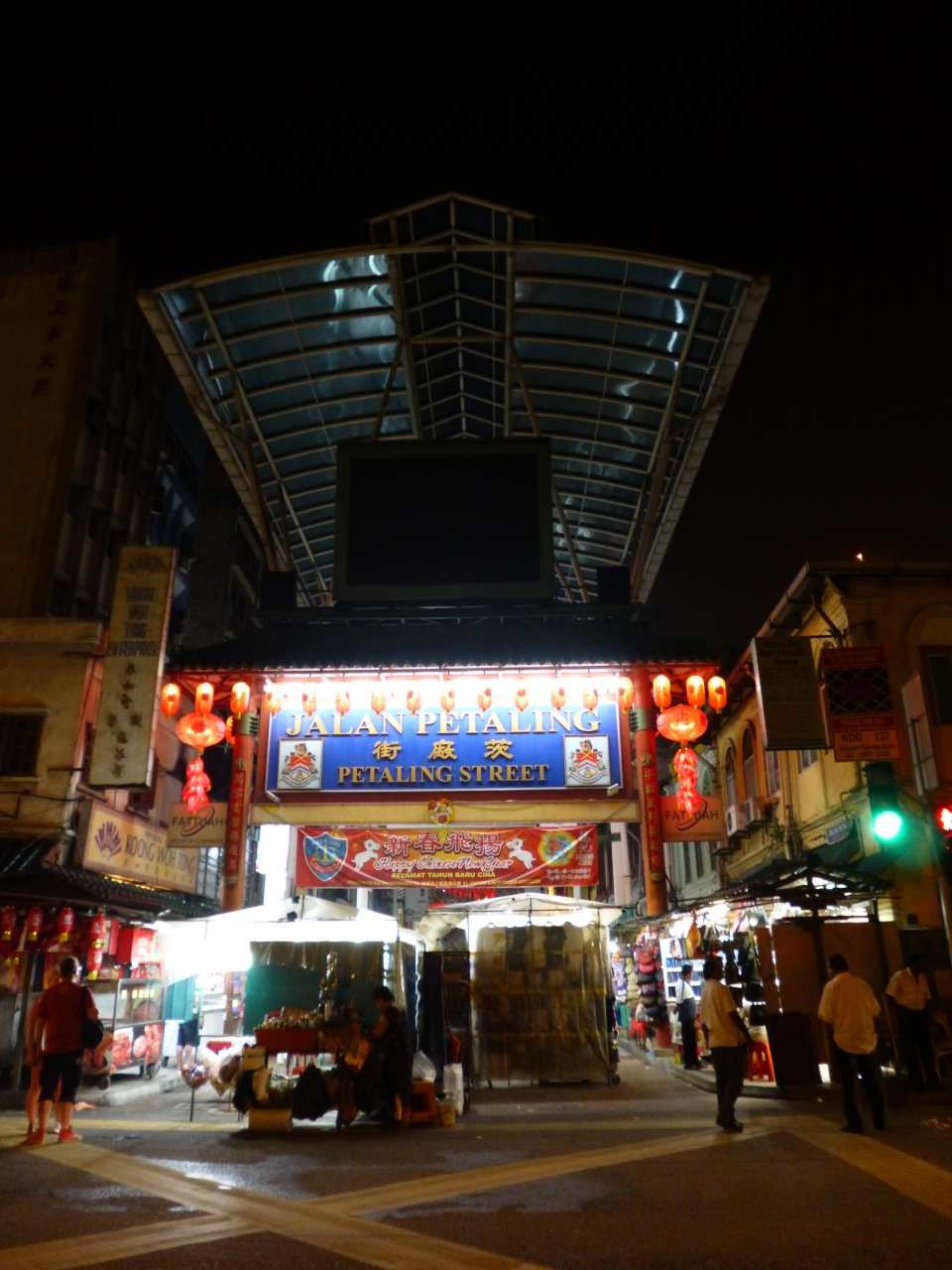 平日の夜に立ち寄りました。ペタリンロードの門はまさにチャイナタウンのイメージ通りでした。また、通りの頭上には赤い提灯が連なっていました。通りにはTシャツ屋さん、下着屋さん、腕時計屋さんなどが並んでいて活気を感じました。日本語で客引きをしている人もいました。