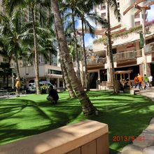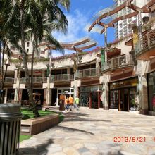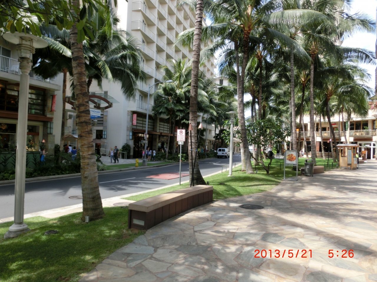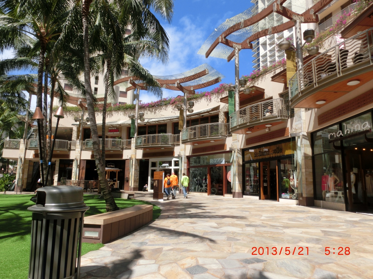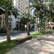 カラカウア通りから海側にのびる道に、レストランやカフェ、ジュエリーショップ、雑貨屋、洋服屋、ABCストアーなど、様々な施設がそろっています。道にはヤシの木や芝生が植えられていて、ハワイらしい開放的で気持ちの良い通りです。ホテルからも近かったので、のんびり散歩しながらウインドーショッピングを楽しみました。